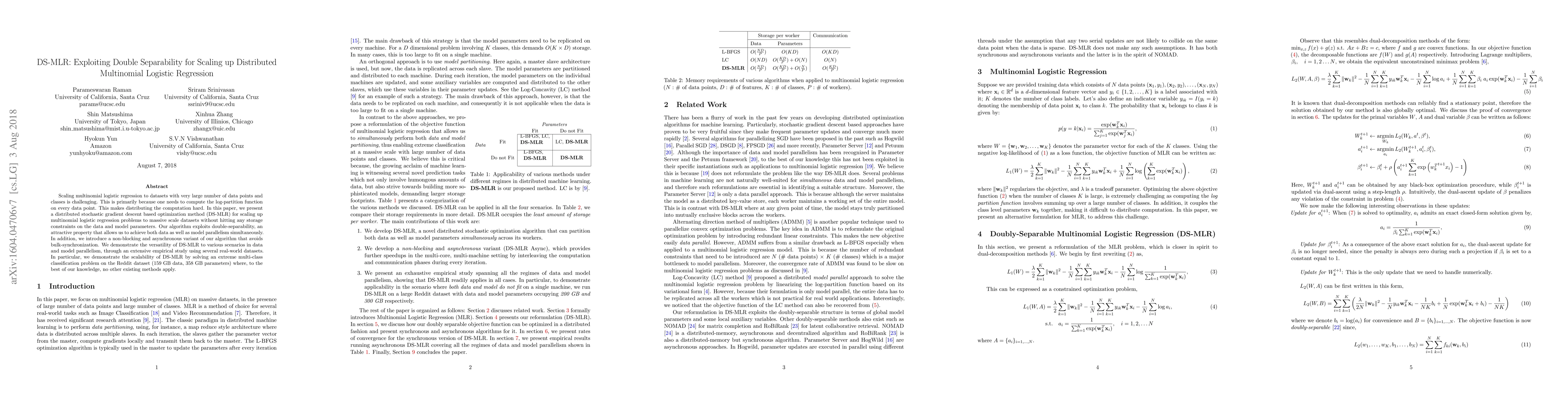 This paper introduces DS-MLR, a distributed stochastic gradient descent method for scaling up multinomial logistic regression, leveraging double-separability for simultaneous data and model parallelism. The method is shown to effectively handle large-scale datasets, demonstrated through successful application to the Reddit dataset.