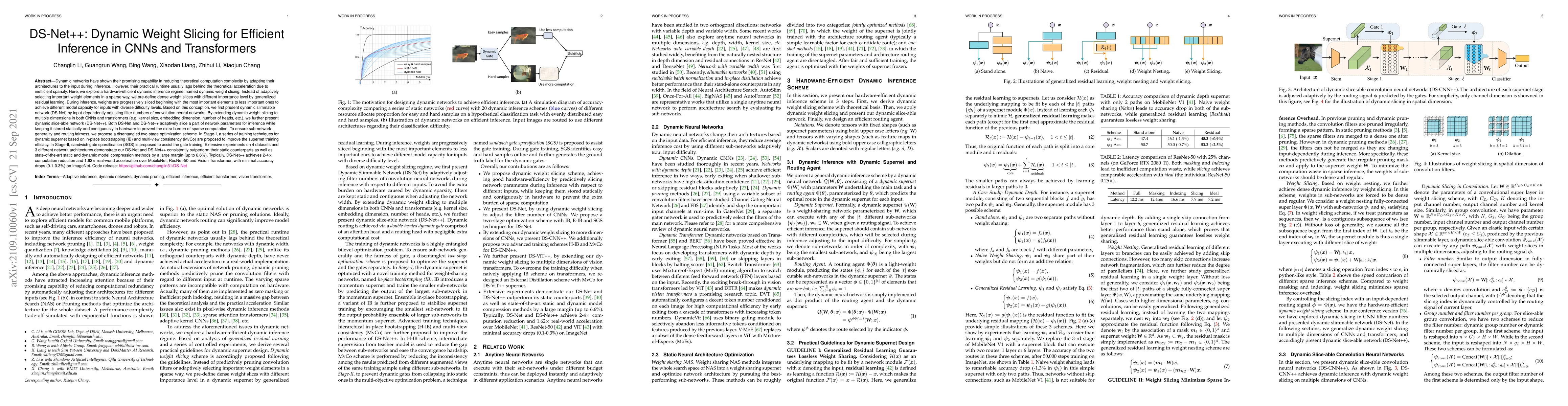 This paper proposes dynamic weight slicing to efficiently adapt CNN and transformer architectures during inference, achieving significant computation reduction and real-world acceleration with minimal accuracy loss. The method, DS-Net++, dynamically adjusts filter numbers and dimensions based on input difficulty, employing a two-stage optimization scheme for training.