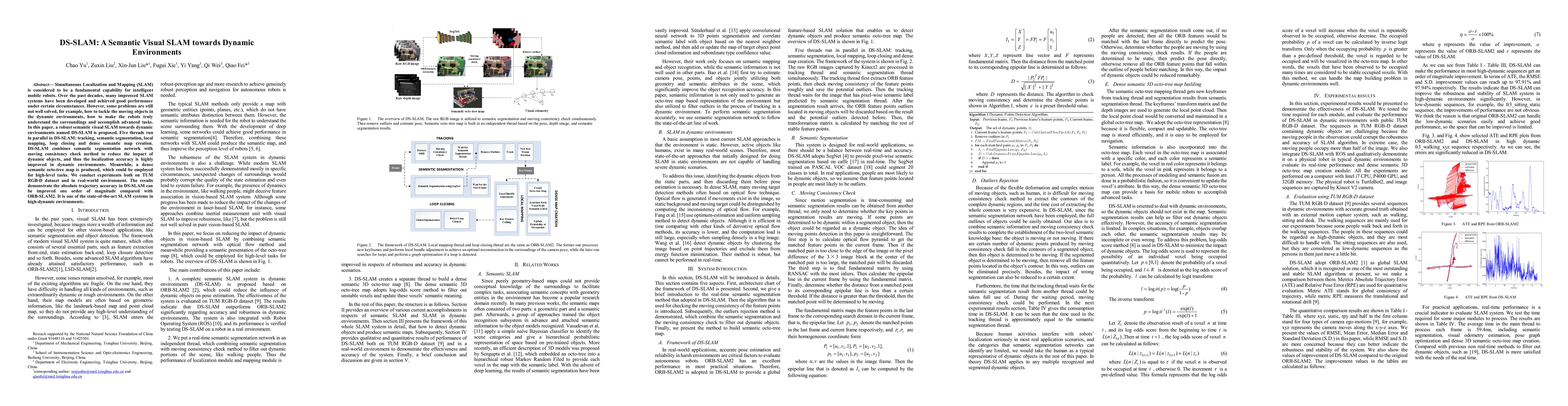 DS-SLAM introduces a semantic visual SLAM system designed for dynamic environments, improving localization accuracy by integrating semantic segmentation and a moving consistency check. Experimental results show a significant boost in trajectory accuracy, outperforming ORB-SLAM2.