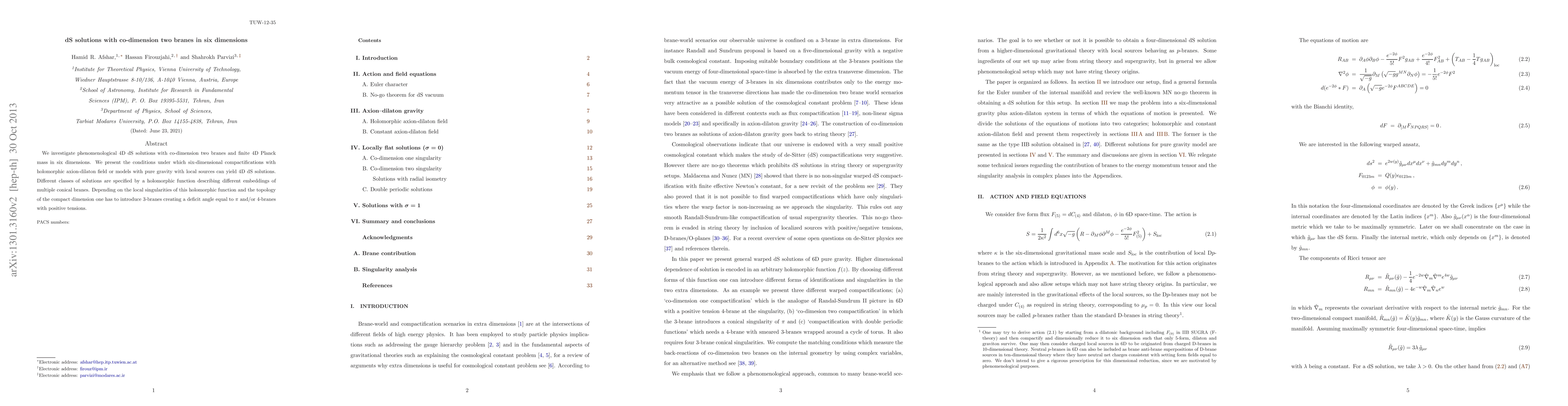 We investigate 4D dS solutions with co-dimension two branes and finite 4D Planck mass in six dimensions. We present the conditions under which six-dimensional compactifications with holomorphic axion-dilaton field or models with pure gravity with local sources can yield 4D dS solutions. Different classes of solutions are specified by a holomorphic function describing different embeddings of multiple conical branes. Depending on the local singularities of this holomorphic function and the topology of the compact dimension one has to introduce D3-branes creating a deficit angle equal to \pi and/or D4-branes with positive tensions.