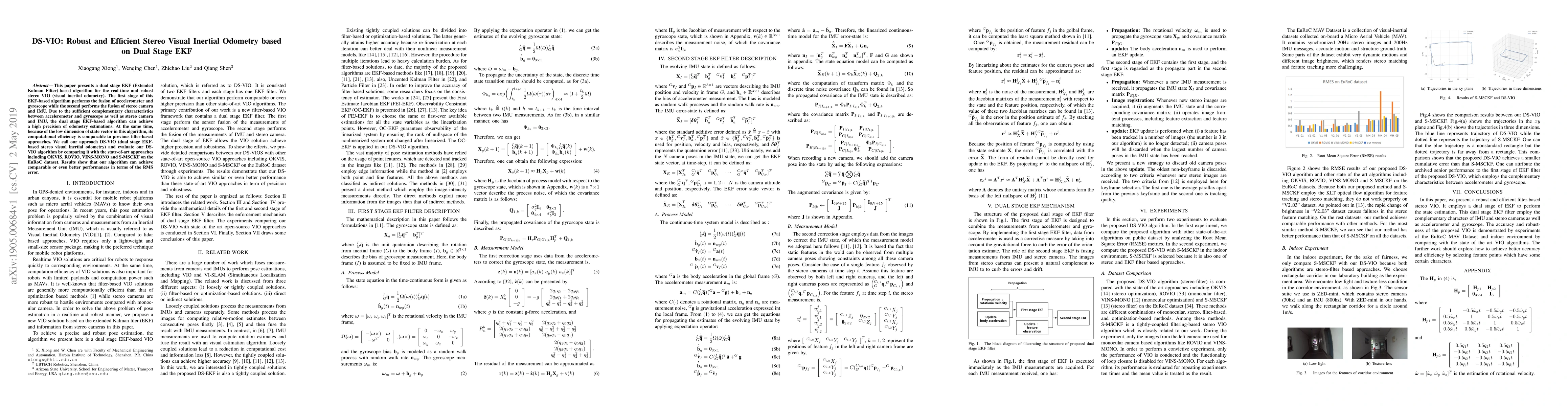 This paper presents a dual stage EKF (Extended Kalman Filter)-based algorithm for the real-time and robust stereo VIO (visual inertial odometry). The first stage of this EKF-based algorithm performs the fusion of accelerometer and gyroscope while the second performs the fusion of stereo camera and IMU. Due to the sufficient complementary characteristics between accelerometer and gyroscope as well as stereo camera and IMU, the dual stage EKF-based algorithm can achieve a high precision of odometry estimations. At the same time, because of the low dimension of state vector in this algorithm, its computational efficiency is comparable to previous filter-based approaches. We call our approach DS-VIO (dual stage EKFbased stereo visual inertial odometry) and evaluate our DSVIO algorithm by comparing it with the state-of-art approaches including OKVIS, ROVIO, VINS-MONO and S-MSCKF on the EuRoC dataset. Results show that our algorithm can achieve comparable or even better performances in terms of the RMS error