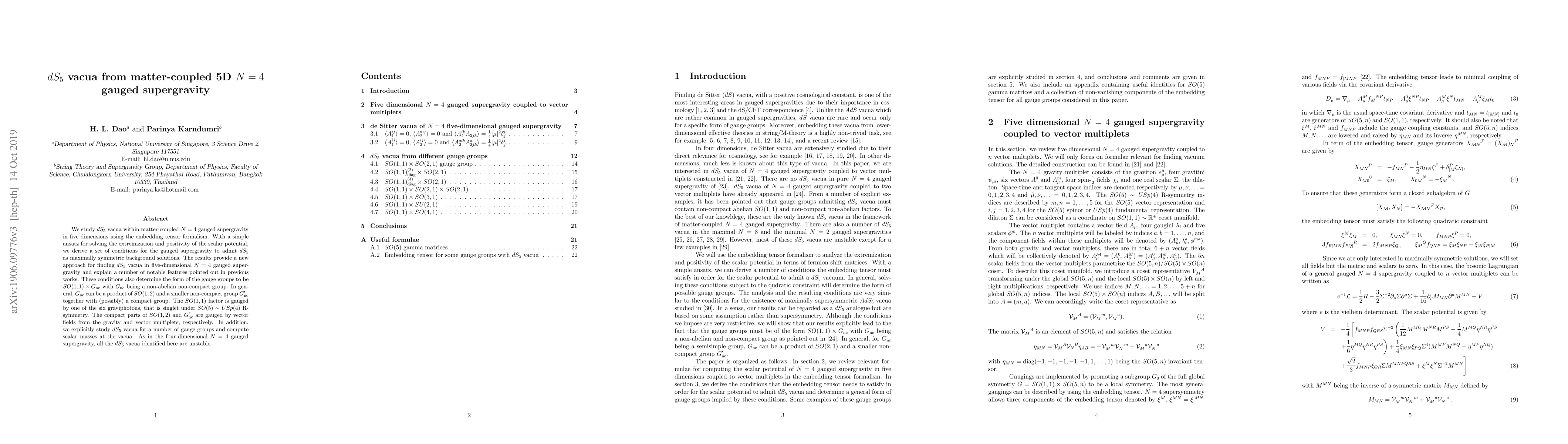 This paper explores $dS_5$ vacua within five-dimensional $N=4$ gauged supergravity, employing the embedding tensor formalism to derive conditions for maximally symmetric solutions. It determines that gauge groups must be of the form $SO(1,1)\times G_{\textrm{nc}}$, where $G_{\textrm{nc}}$ is a non-abelian non-compact group, and computes scalar masses at these vacua, which are found to be unstable.
