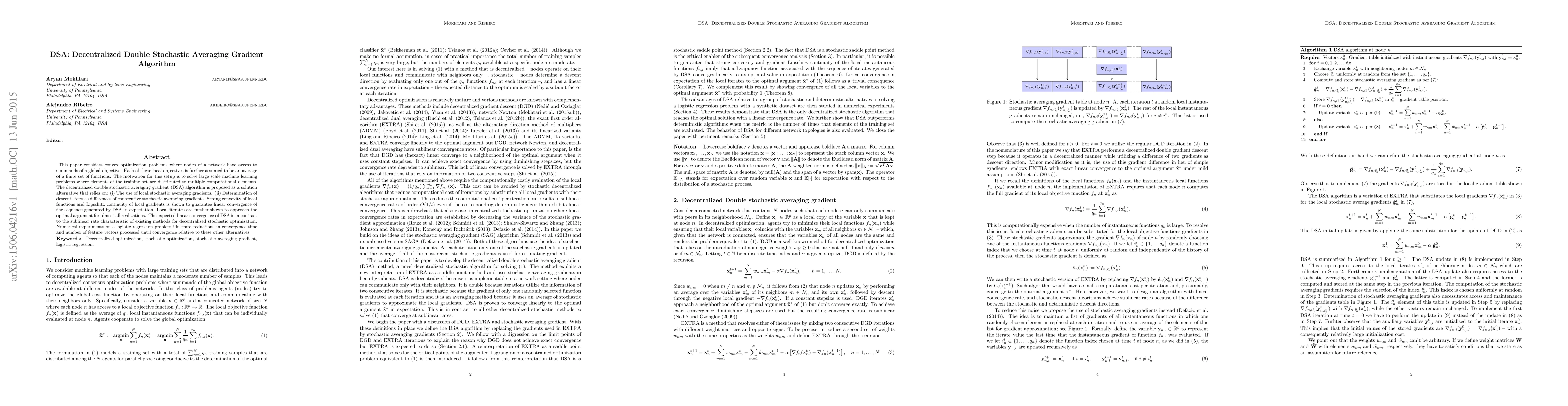 This paper proposes a decentralized double stochastic averaging gradient algorithm (DSA) for solving large-scale machine learning problems with distributed training sets. The DSA algorithm achieves linear convergence under strong convexity and Lipschitz continuity conditions, outperforming existing sublinear methods in numerical experiments.
