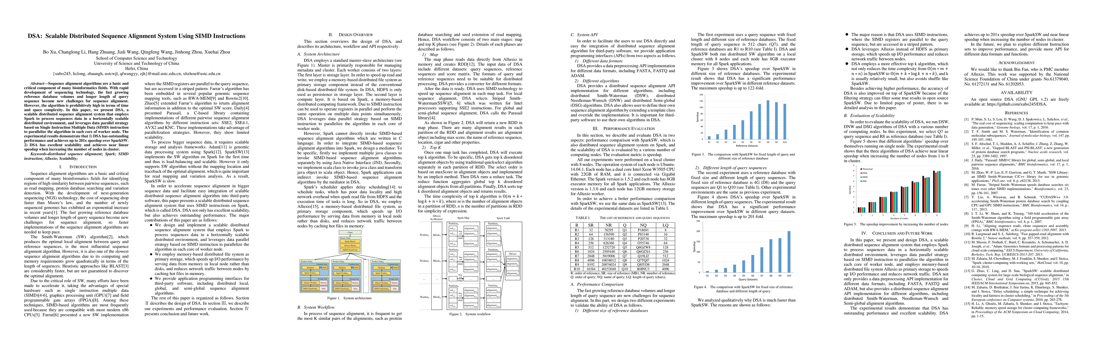 The paper introduces DSA, a scalable distributed sequence alignment system using Spark and SIMD for parallel processing, achieving up to 201x speedup over SparkSW and demonstrating near-linear scalability with increased cluster nodes.