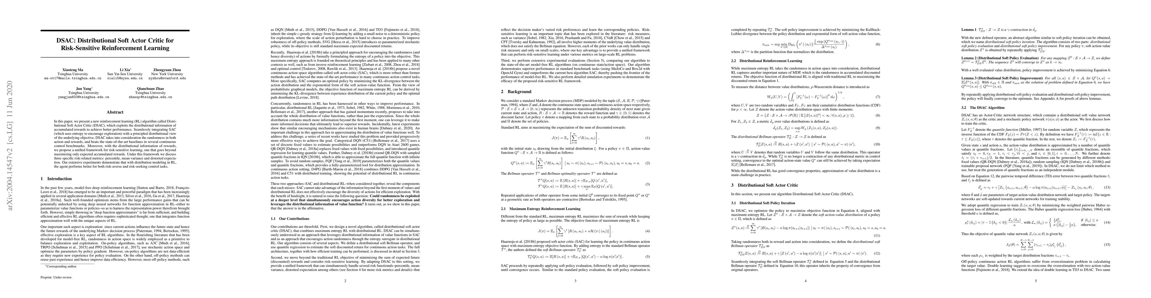 The paper introduces DSAC, a reinforcement learning algorithm that combines distributional information with Soft Actor Critic to enhance performance. It proposes a framework for risk-sensitive learning, addressing metrics like percentile, mean-variance, and distorted expectation, and shows improved results in continuous control tasks.