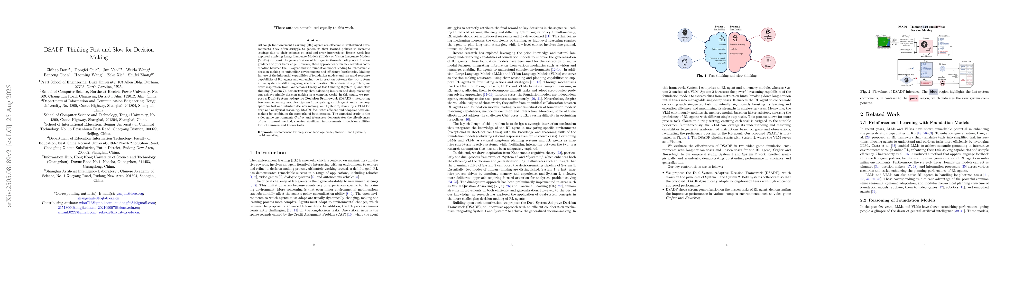 Although Reinforcement Learning (RL) agents are effective in well-defined environments, they often struggle to generalize their learned policies to dynamic settings due to their reliance on trial-and-error interactions. Recent work has explored applying Large Language Models (LLMs) or Vision Language Models (VLMs) to boost the generalization of RL agents through policy optimization guidance or prior knowledge. However, these approaches often lack seamless coordination between the RL agent and the foundation model, leading to unreasonable decision-making in unfamiliar environments and efficiency bottlenecks. Making full use of the inferential capabilities of foundation models and the rapid response capabilities of RL agents and enhancing the interaction between the two to form a dual system is still a lingering scientific question. To address this problem, we draw inspiration from Kahneman's theory of fast thinking (System 1) and slow thinking (System 2), demonstrating that balancing intuition and deep reasoning can achieve nimble decision-making in a complex world. In this study, we propose a Dual-System Adaptive Decision Framework (DSADF), integrating two complementary modules: System 1, comprising an RL agent and a memory space for fast and intuitive decision making, and System 2, driven by a VLM for deep and analytical reasoning. DSADF facilitates efficient and adaptive decision-making by combining the strengths of both systems. The empirical study in the video game environment: Crafter and Housekeep demonstrates the effectiveness of our proposed method, showing significant improvements in decision abilities for both unseen and known tasks.