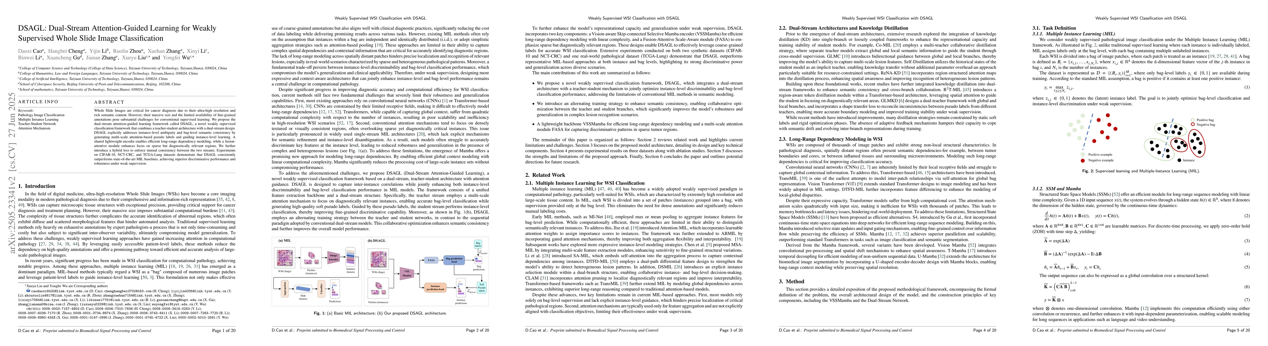 The research proposes DSAGL, a weakly supervised classification framework for whole-slide images (WSIs) using a teacher-student architecture with a dual-stream design. It addresses instance-level ambiguity and bag-level semantic consistency by generating multi-scale attention-based pseudo labels and guiding instance-level learning. A shared lightweight encoder (VSSMamba) models long-range dependencies efficiently, while a fusion-attentive module (FASA) enhances focus on diagnostically relevant regions. A hybrid loss enforces consistency between the two streams.