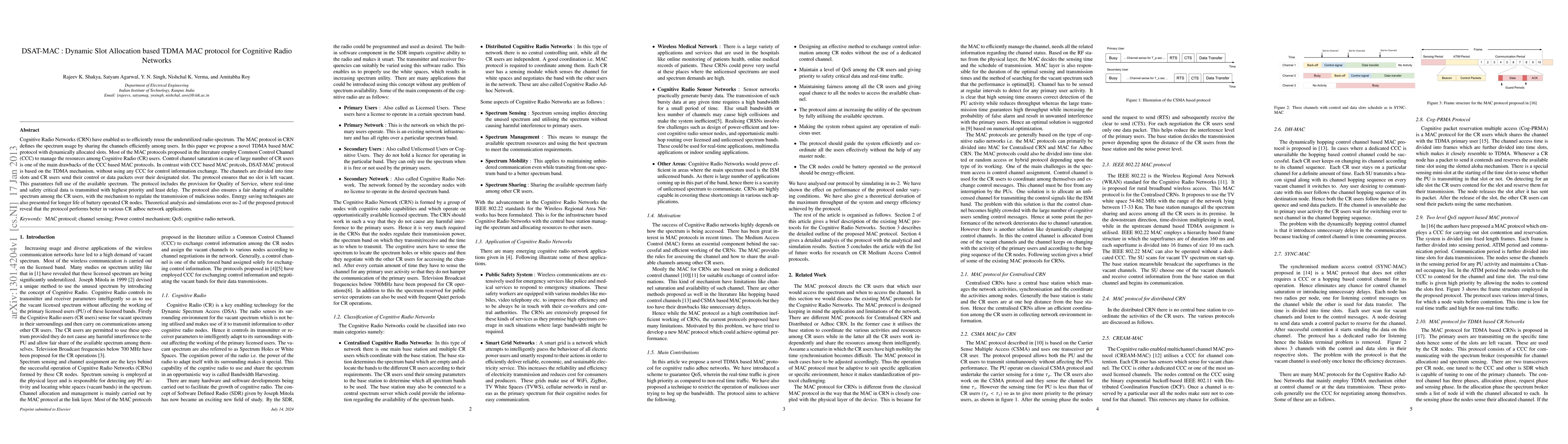 The DSAT-MAC protocol proposes a dynamic TDMA-based MAC protocol for Cognitive Radio Networks that efficiently allocates time slots without using a Common Control Channel, ensuring full spectrum utilization, Quality of Service for critical data, fair spectrum sharing, and energy saving techniques for battery-operated nodes. Theoretical analysis and simulations show improved performance over CCC-based protocols in various CRN applications.
