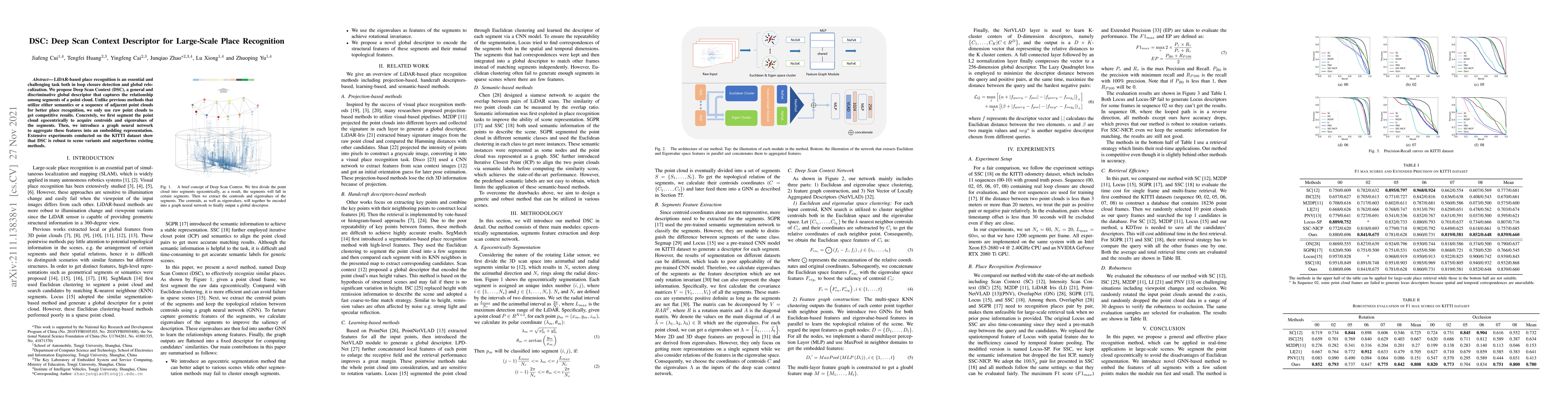 The paper proposes Deep Scan Context (DSC), a novel LiDAR-based global descriptor for place recognition using raw point clouds. DSC segments point clouds to extract features and employs a graph neural network for robust embedding, outperforming existing methods on the KITTI dataset.