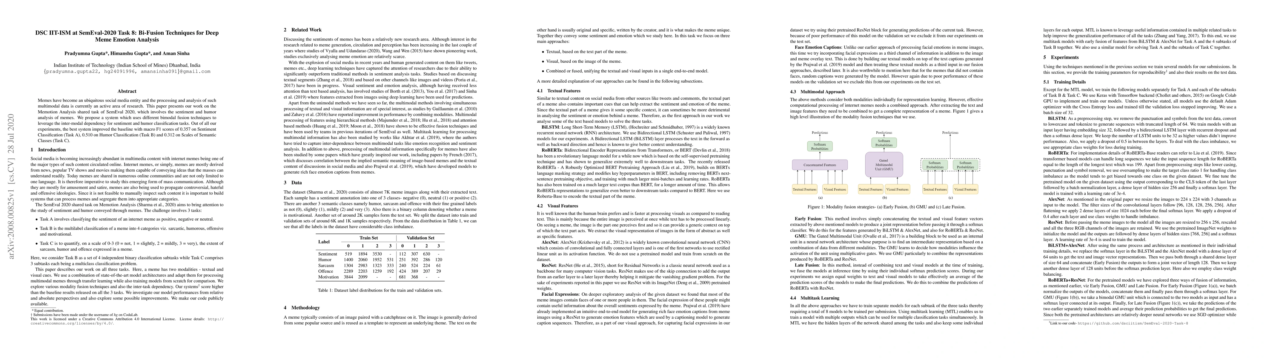 Memes have become an ubiquitous social media entity and the processing and analysis of suchmultimodal data is currently an active area of research. This paper presents our work on theMemotion Analysis shared task of SemEval 2020, which involves the sentiment and humoranalysis of memes. We propose a system which uses different bimodal fusion techniques toleverage the inter-modal dependency for sentiment and humor classification tasks. Out of all ourexperiments, the best system improved the baseline with macro F1 scores of 0.357 on SentimentClassification (Task A), 0.510 on Humor Classification (Task B) and 0.312 on Scales of SemanticClasses (Task C).
