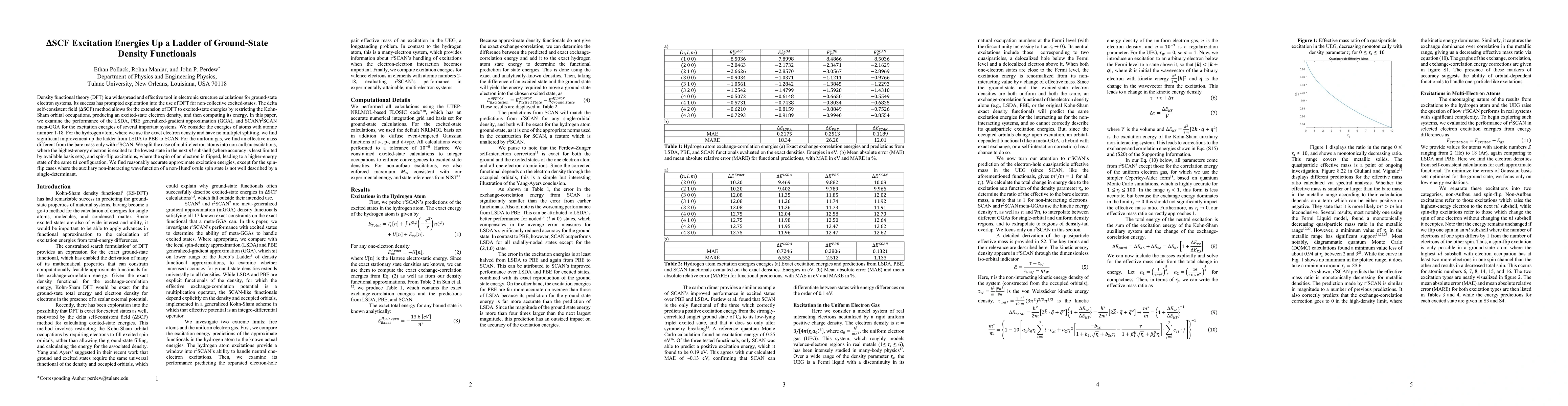 Density functional theory (DFT) is a widespread and effective tool in electronic structure calculations for ground-state electron systems. Its success has prompted exploration into the use of DFT for non-collective excited states. The delta self-consistent field ($\Delta$SCF) method allows for the extension of DFT to excited-state energies by restricting the Kohn-Sham orbital occupations, producing an excited-state electron density, and then computing its energy. In this paper, we examine the performance of the LSDA, PBE generalized-gradient approximation (GGA), and SCAN/r2SCAN meta-GGA for the excitation energies of several important systems. We consider the energies of atoms with atomic number 1-18. For the hydrogen atom, where we use the exact electron density and have no multiplet splitting, we find significant improvement up the ladder from LSDA to PBE to SCAN. For the uniform gas, we find an effective mass different from the bare mass only with r2SCAN. We split the case of multi-electron atoms into non-aufbau excitations, where the highest-energy electron is excited to the lowest state in the next nl subshell (where accuracy is least limited by available basis sets), and spin-flip excitations, where the spin of an electorn is flipped, leading to a higher-energy state of the same nl configuration. We find reasonably accurate approximate excitation energies, except for the spin-flip cases where the auxiliary non-interacting wavefunction of a non-Hund's-rule spin state is not well-described by a single determinant.