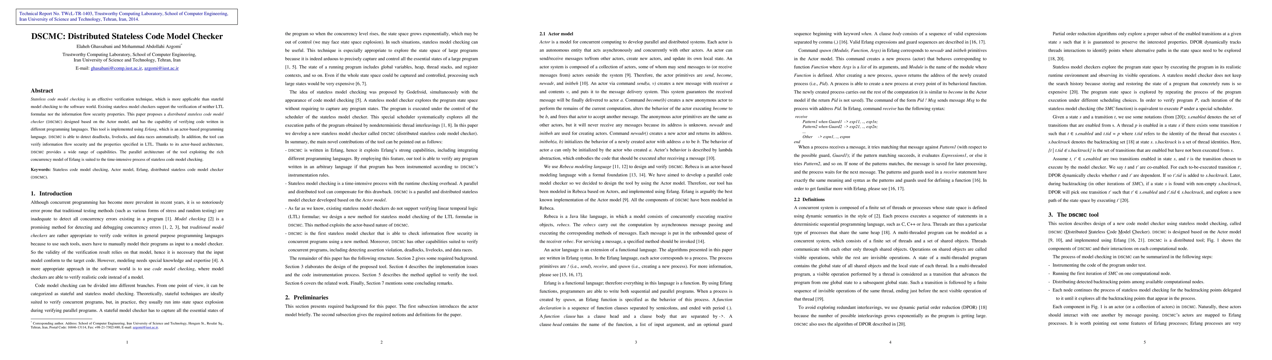 The paper introduces DSCMC, a distributed stateless code model checker based on the Actor model, implemented in Erlang to verify code across various languages, detect deadlocks, livelocks, and data races, and verify information flow security and LTL properties. Its parallel architecture leverages Erlang's concurrency for efficient stateless model checking.