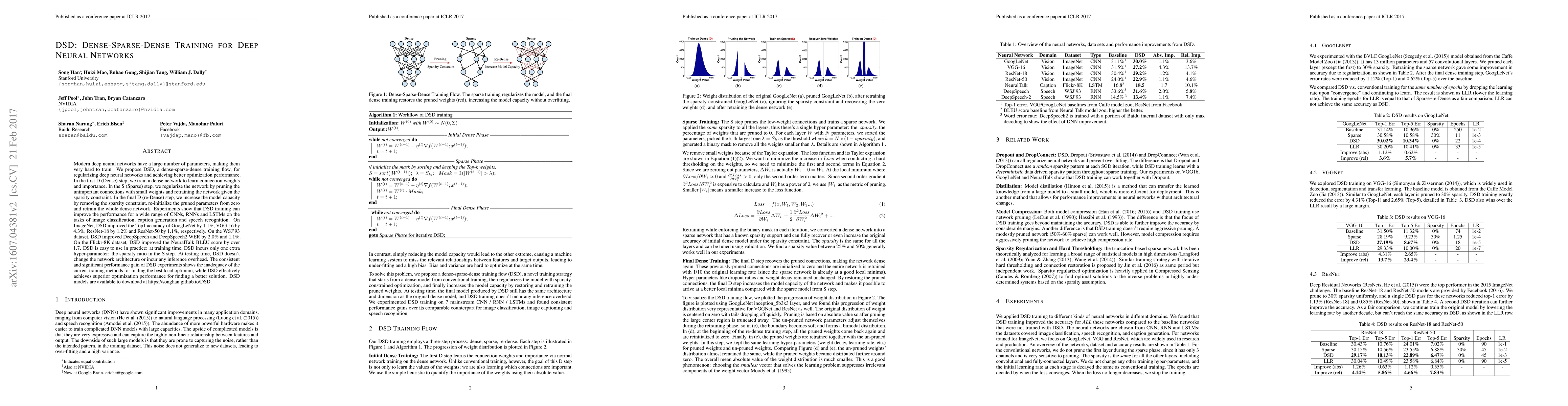 The paper proposes DSD, a dense-sparse-dense training method to regularize deep neural networks, achieving better optimization performance. DSD improves performance across various tasks and models, demonstrating significant gains without additional inference overhead.