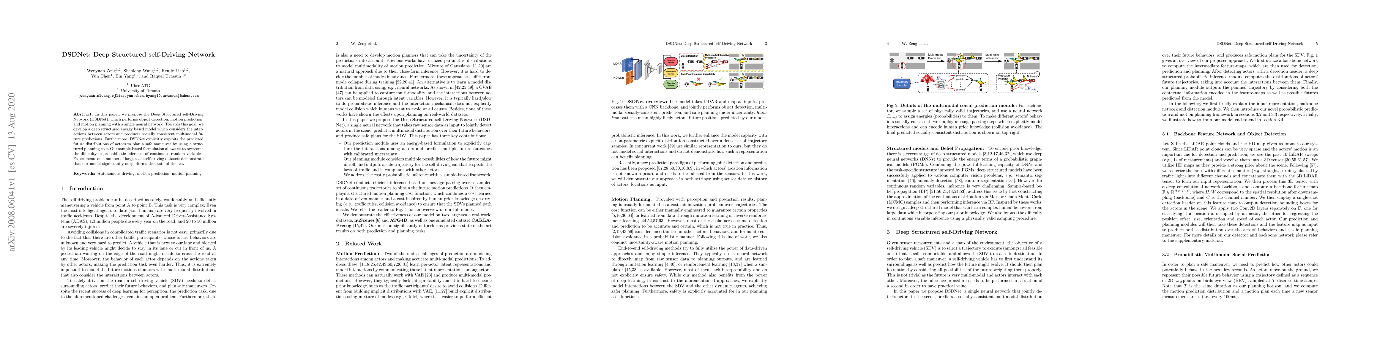 DSDNet is a single neural network designed for object detection, motion prediction, and planning in self-driving scenarios. It uses a deep structured energy-based model to generate socially consistent multimodal future predictions and a structured planning cost for safe maneuvers.