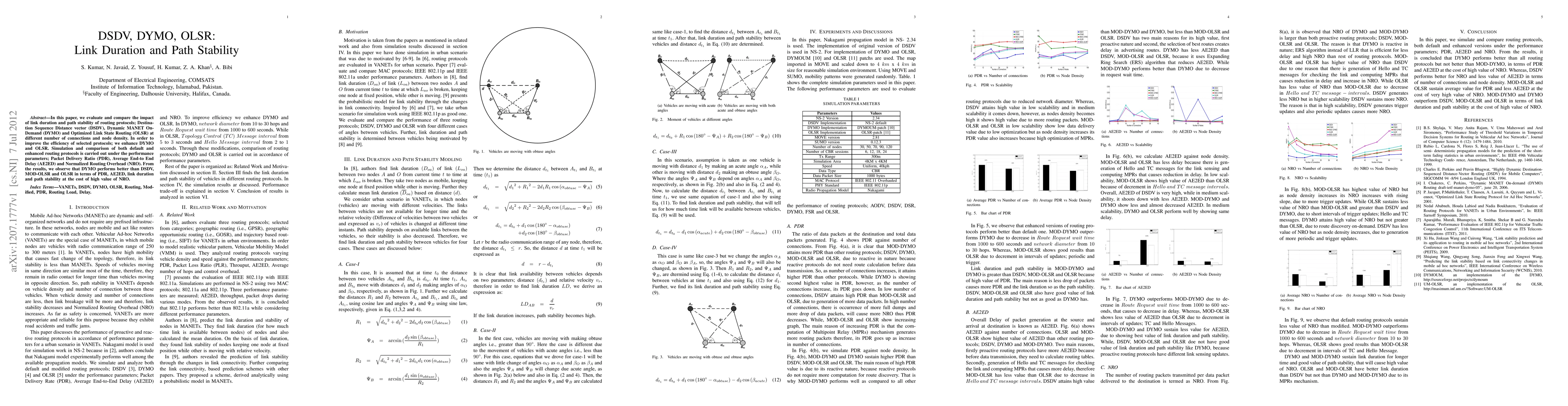 This paper evaluates the link duration and path stability of DSDV, DYMO, and OLSR routing protocols under varying node densities. Enhanced DYMO and OLSR show improved performance in terms of Packet Delivery Ratio and Average End-to-End Delay, though at the expense of higher routing overhead.