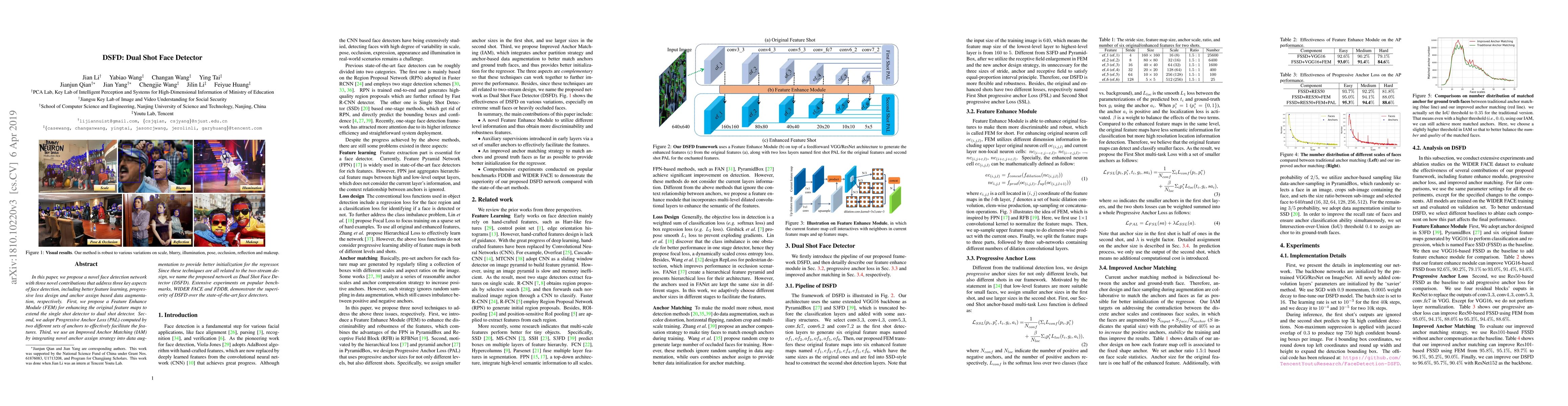 The paper introduces the Dual Shot Face Detector (DSFD), a novel face detection network that enhances feature learning, employs progressive loss design, and uses anchor assign-based data augmentation. The proposed Feature Enhance Module, Progressive Anchor Loss, and Improved Anchor Matching collectively improve detection performance, outperforming state-of-the-art methods on WIDER FACE and FDDB benchmarks.