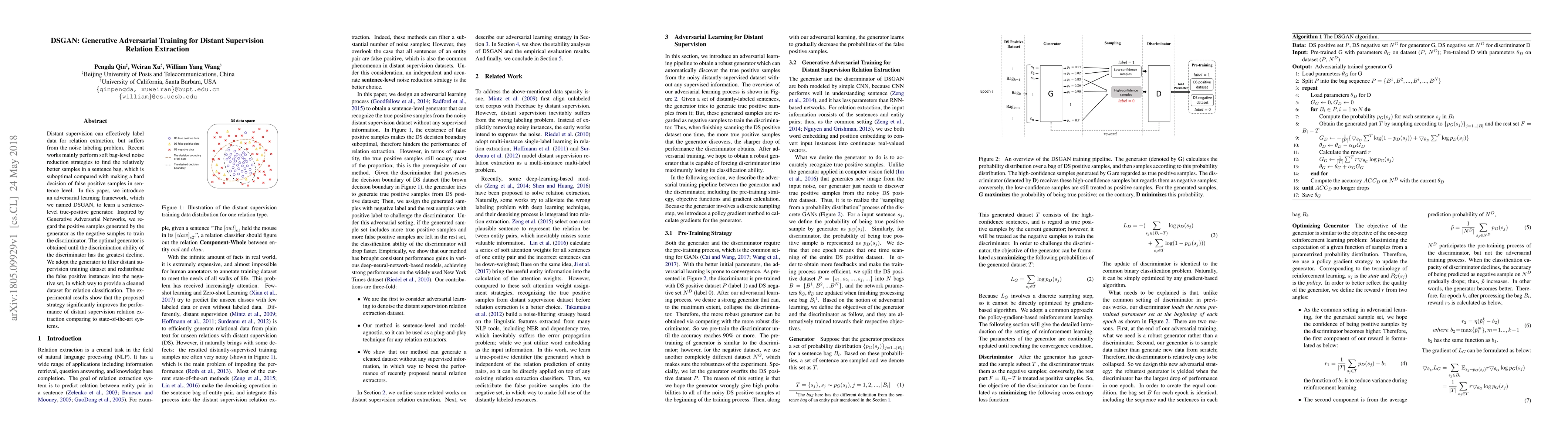 DSGAN employs an adversarial learning framework to filter false positives in distant supervision for relation extraction, improving dataset quality and boosting relation classification performance over existing methods. The sentence-level true-positive generator enhances dataset cleanliness, demonstrating significant gains in distant supervision relation extraction.