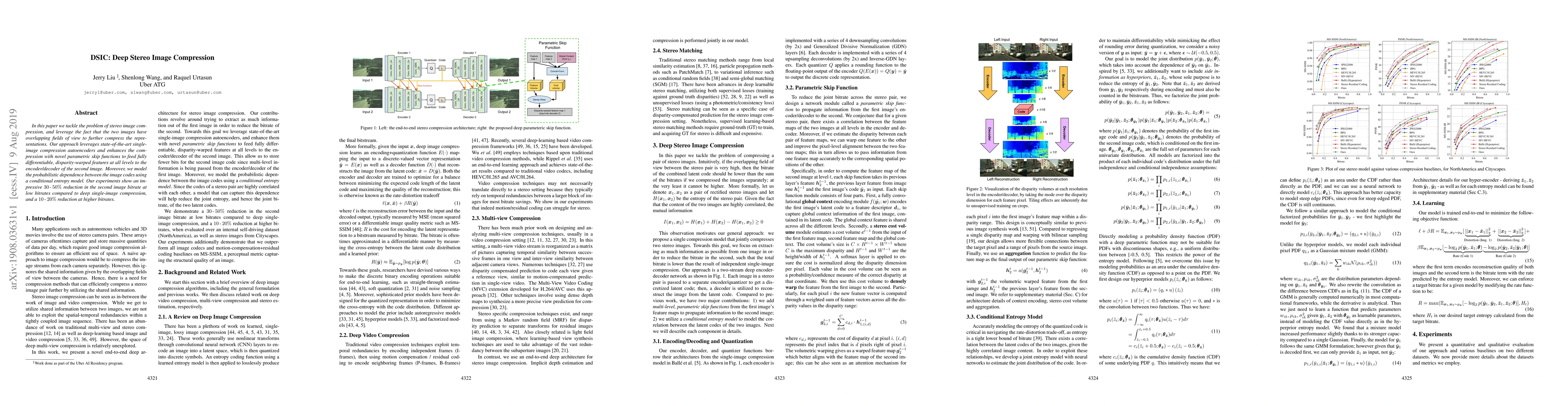 This paper proposes DSIC, a deep stereo image compression method that leverages overlapping fields of view in stereo images to achieve significant compression. It employs advanced autoencoders and parametric skip functions, along with a conditional entropy model to reduce the bitrate of the second image by 30-50% at low bitrates and 10-20% at higher bitrates compared to single-image compression.
