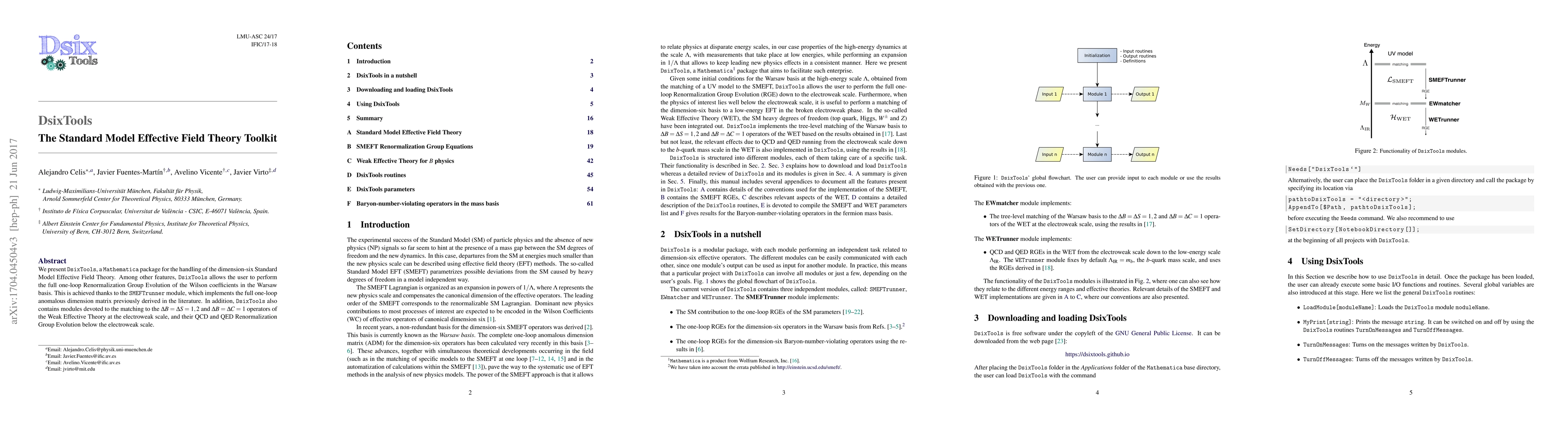 DsixTools is a Mathematica package designed for managing the dimension-six Standard Model Effective Field Theory, featuring full one-loop Renormalization Group Evolution of Wilson coefficients and modules for matching and evolution of specific weak and QCD/QED operators. The SMEFTrunner module implements the one-loop anomalous dimension matrix.