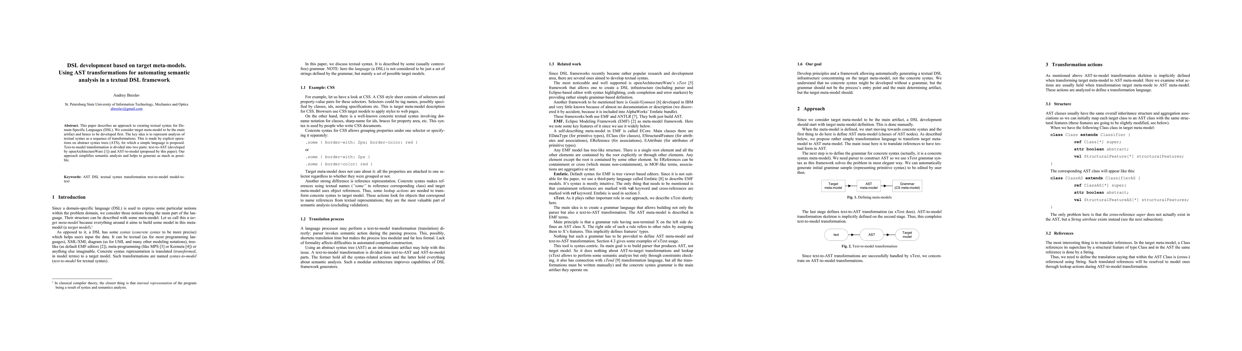 This paper describes an approach to creating textual syntax for Do- main-Specific Languages (DSL). We consider target meta-model to be the main artifact and hence to be developed first. The key idea is to represent analysis of textual syntax as a sequence of transformations. This is made by explicit opera- tions on abstract syntax trees (ATS), for which a simple language is proposed. Text-to-model transformation is divided into two parts: text-to-AST (developed by openArchitectureWare [1]) and AST-to-model (proposed by this paper). Our approach simplifies semantic analysis and helps to generate as much as possi- ble.