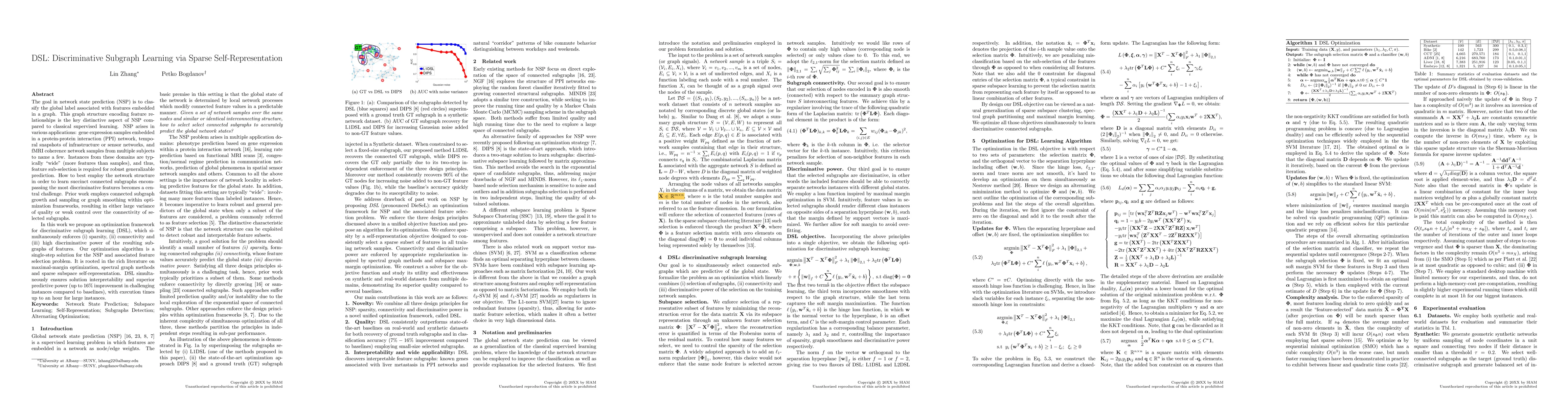 This paper proposes a novel optimization framework for discriminative subgraph learning (DSL) to enhance network state prediction (NSP) by identifying succinct connected subgraphs that maximize feature discriminative power while enforcing sparsity and connectivity. The method achieves up to 16% improvement over baselines and integrates insights from maximal-margin optimization, spectral graph theory, and sparse self-representation.