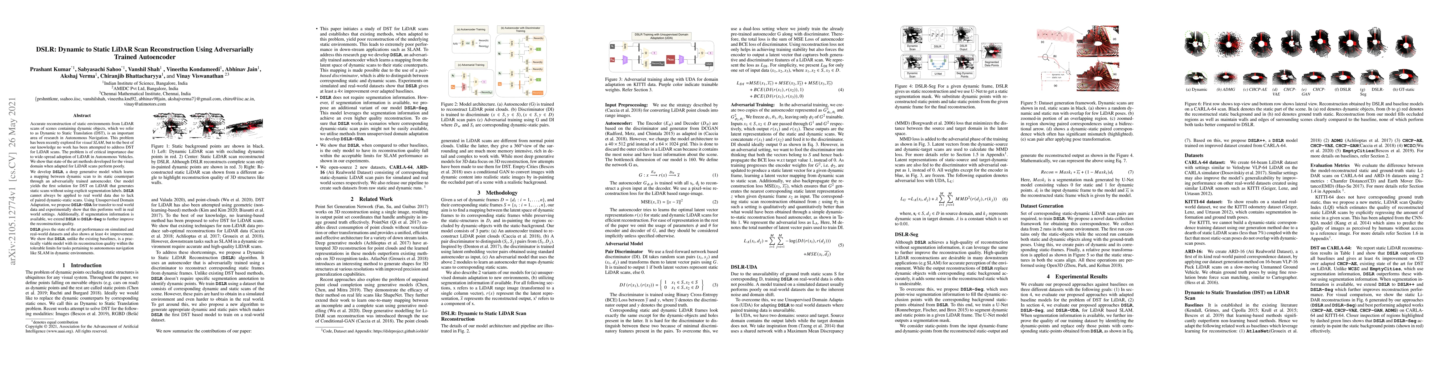 DSLR is a deep generative model that reconstructs static LiDAR scans from dynamic scans using an adversarially trained autoencoder, addressing the Dynamic to Static Translation (DST) problem. It achieves state-of-the-art performance on both simulated and real-world datasets, demonstrating at least a 4x improvement over existing methods.