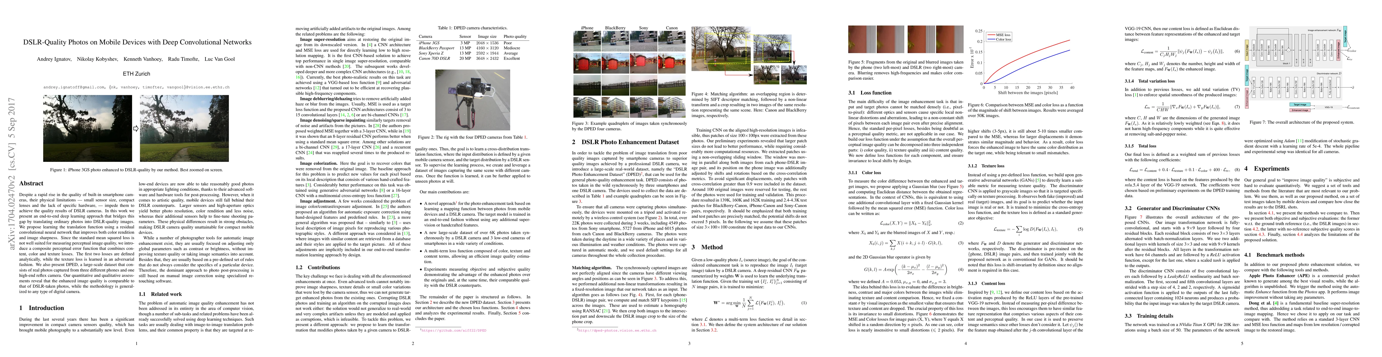 This paper proposes a deep learning method using residual convolutional networks to convert smartphone photos to DSLR-quality images, employing a composite perceptual error function for improved color and sharpness. The approach is validated using a new dataset, DPED, and shows comparable results to DSLR photos.