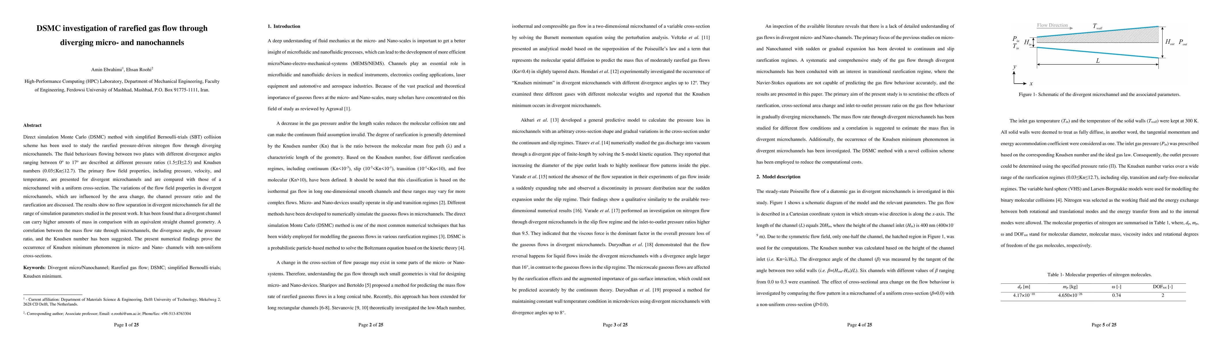 The paper presents a detailed DSMC investigation of rarefied gas flow through diverging microchannels, providing insights into flow characteristics, mass flux, and the Knudsen minimum phenomenon.