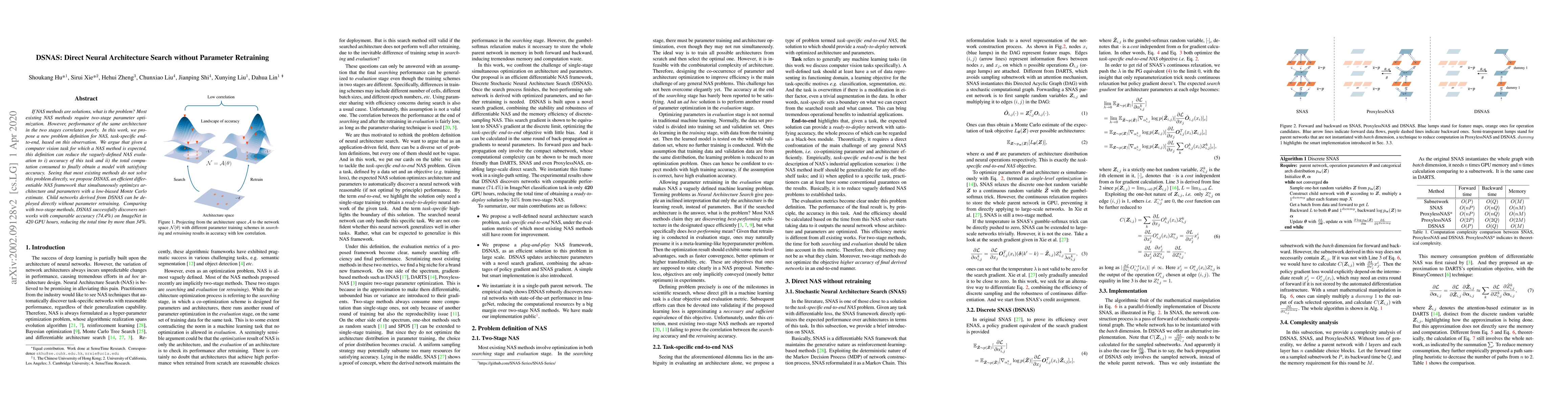 This paper introduces DSNAS, a new approach to neural architecture search that reduces computation time while maintaining accuracy, by optimizing both architecture and parameters in a single stage.