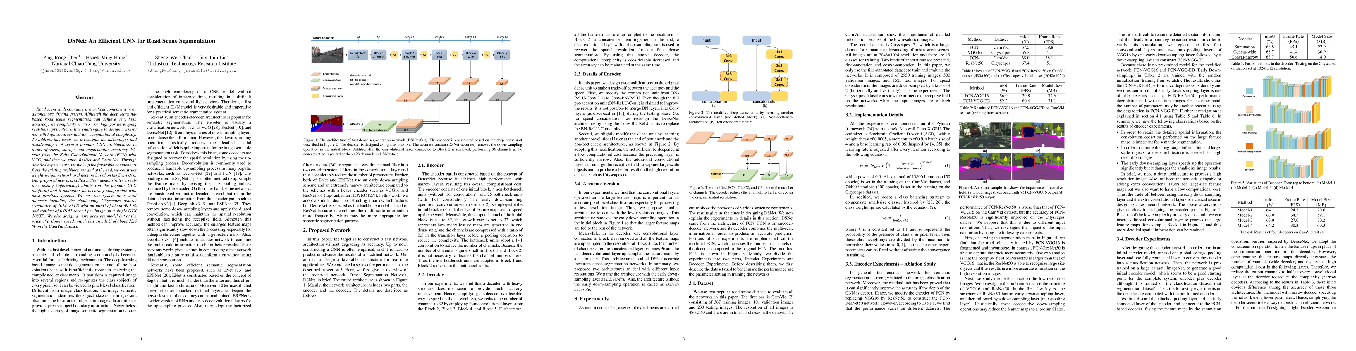 DSNet is a lightweight CNN architecture designed for efficient road scene segmentation in autonomous driving systems, balancing high accuracy with low computational complexity. It achieves real-time performance with an mIoU of 69.1% on the Cityscapes dataset, demonstrating a runtime of 0.0147 seconds per image on a GTX 1080Ti GPU.
