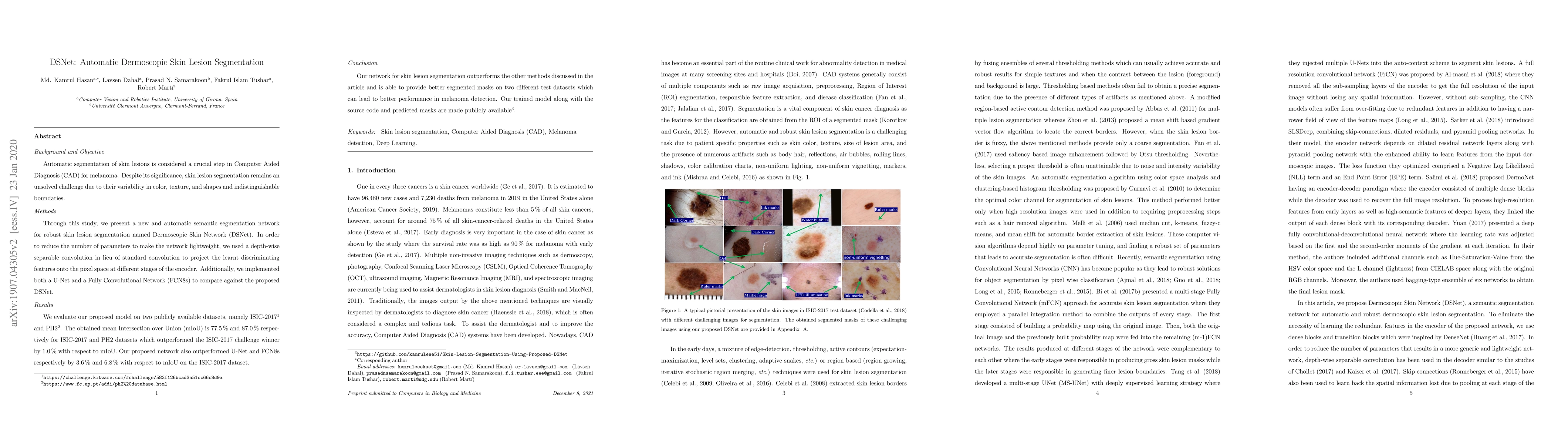 Automatic segmentation of skin lesion is considered a crucial step in Computer Aided Diagnosis (CAD) for melanoma diagnosis. Despite its significance, skin lesion segmentation remains a challenging task due to their diverse color, texture, and indistinguishable boundaries and forms an open problem. Through this study, we present a new and automatic semantic segmentation network for robust skin lesion segmentation named Dermoscopic Skin Network (DSNet). In order to reduce the number of parameters to make the network lightweight, we used depth-wise separable convolution in lieu of standard convolution to project the learned discriminating features onto the pixel space at different stages of the encoder. Additionally, we implemented U-Net and Fully Convolutional Network (FCN8s) to compare against the proposed DSNet. We evaluate our proposed model on two publicly available datasets, namely ISIC-2017 and PH2. The obtained mean Intersection over Union (mIoU) is 77.5 % and 87.0 % respectively for ISIC-2017 and PH2 datasets which outperformed the ISIC-2017 challenge winner by 1.0 % with respect to mIoU. Our proposed network also outperformed U-Net and FCN8s respectively by 3.6 % and 6.8 % with respect to mIoU on the ISIC-2017 dataset. Our network for skin lesion segmentation outperforms other methods and can provide better segmented masks on two different test datasets which can lead to better performance in melanoma detection. Our trained model along with the source code and predicted masks are made publicly available.