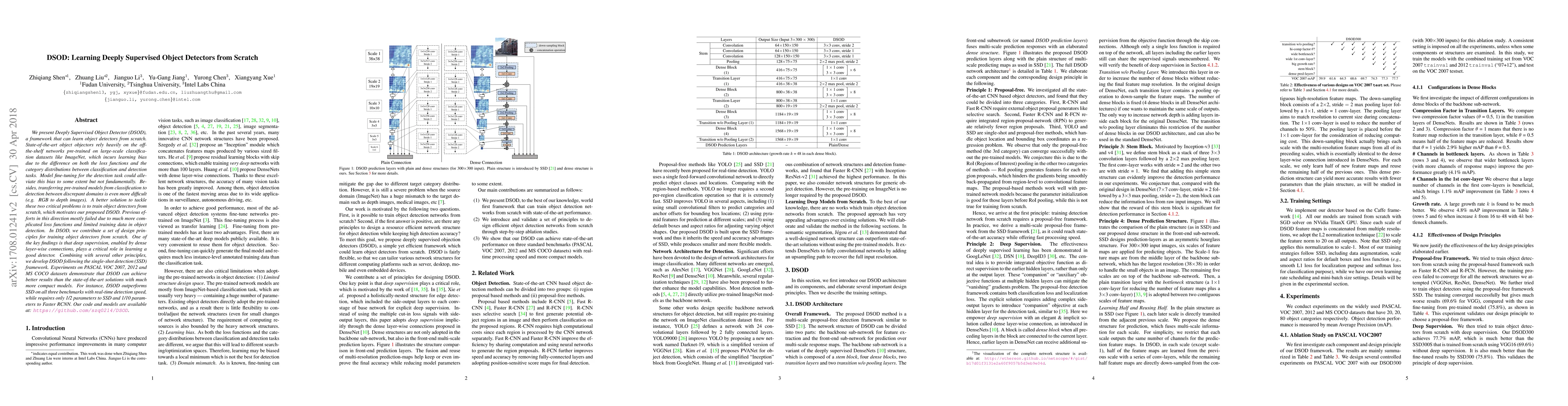 We present Deeply Supervised Object Detector (DSOD), a framework that can learn object detectors from scratch. State-of-the-art object objectors rely heavily on the off-the-shelf networks pre-trained on large-scale classification datasets like ImageNet, which incurs learning bias due to the difference on both the loss functions and the category distributions between classification and detection tasks. Model fine-tuning for the detection task could alleviate this bias to some extent but not fundamentally. Besides, transferring pre-trained models from classification to detection between discrepant domains is even more difficult (e.g. RGB to depth images). A better solution to tackle these two critical problems is to train object detectors from scratch, which motivates our proposed DSOD. Previous efforts in this direction mostly failed due to much more complicated loss functions and limited training data in object detection. In DSOD, we contribute a set of design principles for training object detectors from scratch. One of the key findings is that deep supervision, enabled by dense layer-wise connections, plays a critical role in learning a good detector. Combining with several other principles, we develop DSOD following the single-shot detection (SSD) framework. Experiments on PASCAL VOC 2007, 2012 and MS COCO datasets demonstrate that DSOD can achieve better results than the state-of-the-art solutions with much more compact models. For instance, DSOD outperforms SSD on all three benchmarks with real-time detection speed, while requires only 1/2 parameters to SSD and 1/10 parameters to Faster RCNN. Our code and models are available at: https://github.com/szq0214/DSOD .