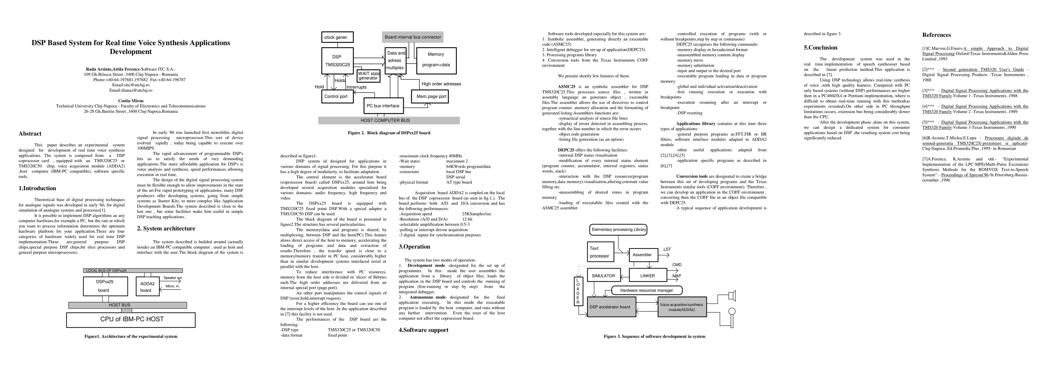 This paper describes an experimental system designed for development of real time voice synthesis applications. The system is composed from a DSP coprocessor card, equipped with an TMS320C25 or TMS320C50 chip, voice acquisition module (ADDA2),host computer (IBM-PC compatible), software specific tools.