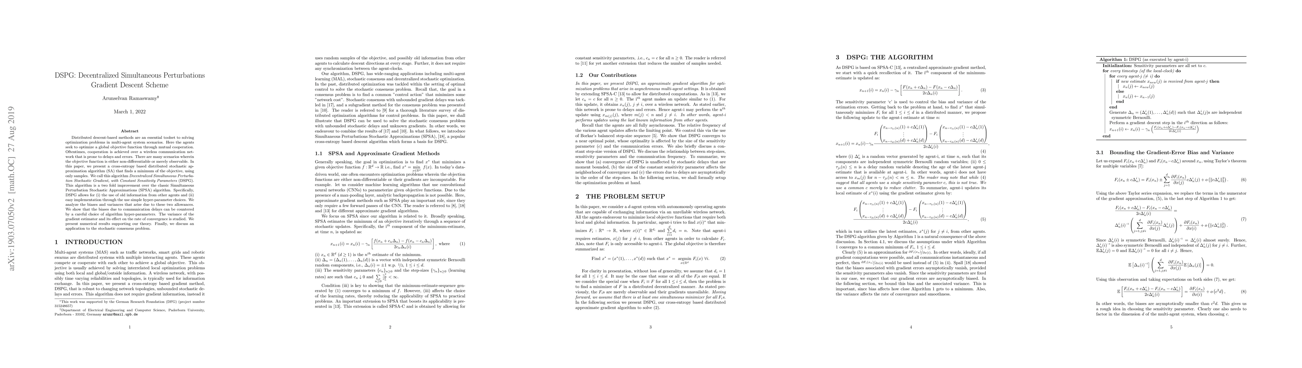 Distributed descent-based methods are an essential toolset to solving optimization problems in multi-agent system scenarios. Here the agents seek to optimize a global objective function through mutual cooperation. Oftentimes, cooperation is achieved over a wireless communication network that is prone to delays and errors. There are many scenarios wherein the objective function is either non-differentiable or merely observable. In this paper, we present a cross-entropy based distributed stochastic approximation algorithm (SA) that finds a minimum of the objective, using only samples. We call this algorithm Decentralized Simultaneous Perturbation Stochastic Gradient, with Constant Sensitivity Parameters (DSPG). This algorithm is a two fold improvement over the classic Simultaneous Perturbation Stochastic Approximations (SPSA) algorithm. Specifically, DSPG allows for (i) the use of old information from other agents and (ii) easy implementation through the use simple hyper-parameter choices. We analyze the biases and variances that arise due to these two allowances. We show that the biases due to communication delays can be countered by a careful choice of algorithm hyper-parameters. The variance of the gradient estimator and its effect on the rate of convergence is studied. We present numerical results supporting our theory. Finally, we discuss an application to the stochastic consensus problem.