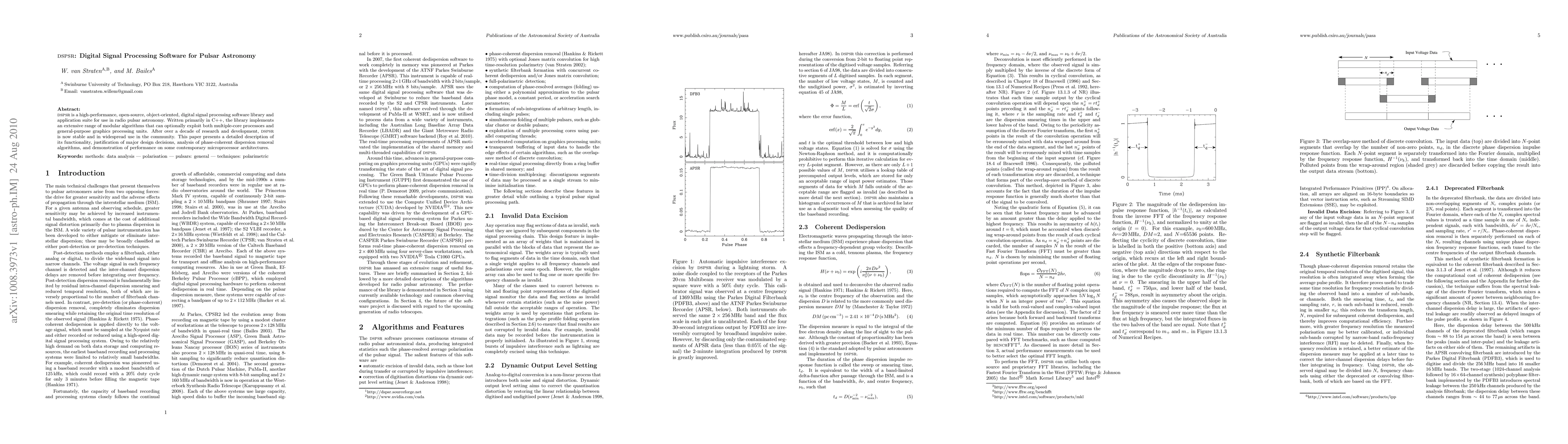 DSPSR is a robust, open-source digital signal processing library for pulsar astronomy, offering modular algorithms optimized for multi-core and GPU processing. The paper details its functionality, design choices, and performance analysis across various architectures.
