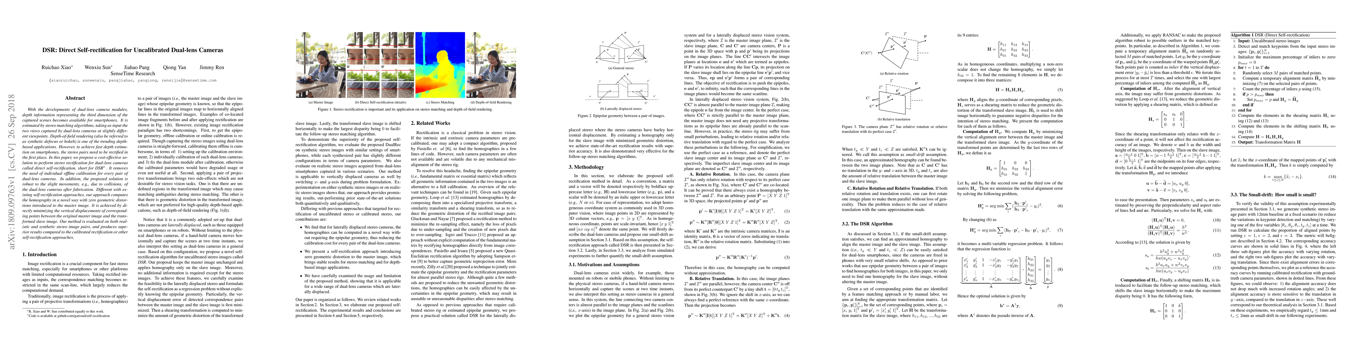 With the developments of dual-lens camera modules,depth information representing the third dimension of thecaptured scenes becomes available for smartphones. It isestimated by stereo matching algorithms, taking as input thetwo views captured by dual-lens cameras at slightly differ-ent viewpoints. Depth-of-field rendering (also be referred toas synthetic defocus or bokeh) is one of the trending depth-based applications. However, to achieve fast depth estima-tion on smartphones, the stereo pairs need to be rectified inthe first place. In this paper, we propose a cost-effective so-lution to perform stereo rectification for dual-lens camerascalled direct self-rectification, short for DSR1. It removesthe need of individual offline calibration for every pair ofdual-lens cameras. In addition, the proposed solution isrobust to the slight movements, e.g., due to collisions, ofthe dual-lens cameras after fabrication. Different with ex-isting self-rectification approaches, our approach computesthe homography in a novel way with zero geometric distor-tions introduced to the master image. It is achieved by di-rectly minimizing the vertical displacements of correspond-ing points between the original master image and the trans-formed slave image. Our method is evaluated on both real-istic and synthetic stereo image pairs, and produces supe-rior results compared to the calibrated rectification or otherself-rectification approaches