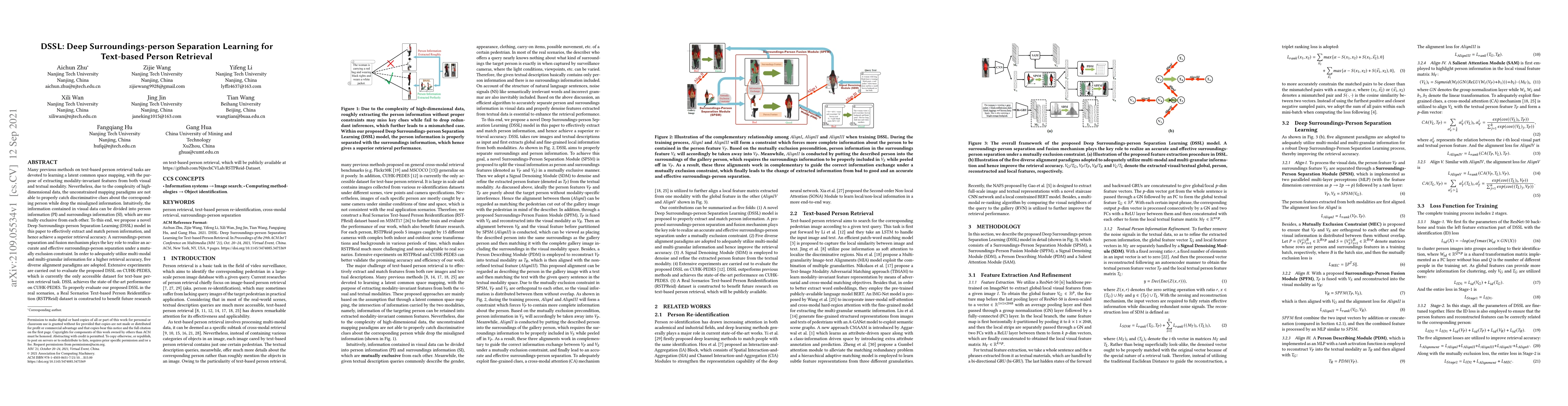 The paper proposes a Deep Surroundings-person Separation Learning (DSSL) model to enhance text-based person retrieval by separating person information from surroundings information, achieving superior retrieval accuracy. The model employs a surroundings-person separation and fusion mechanism and utilizes five diverse alignment paradigms to maximize multi-modal and multi-granular information, achieving state-of-the-art performance on the CUHK-PEDES dataset.