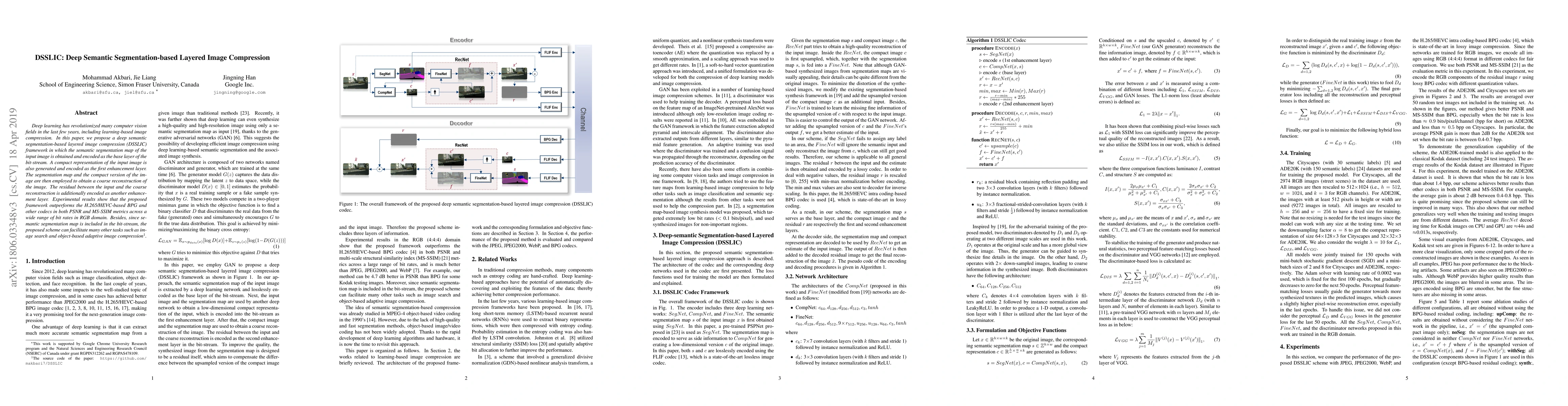A new image compression framework called DSSLIC outperforms traditional codecs in PSNR and MS-SSIM metrics across various bit rates, offering potential for tasks like image search and object-based adaptation.