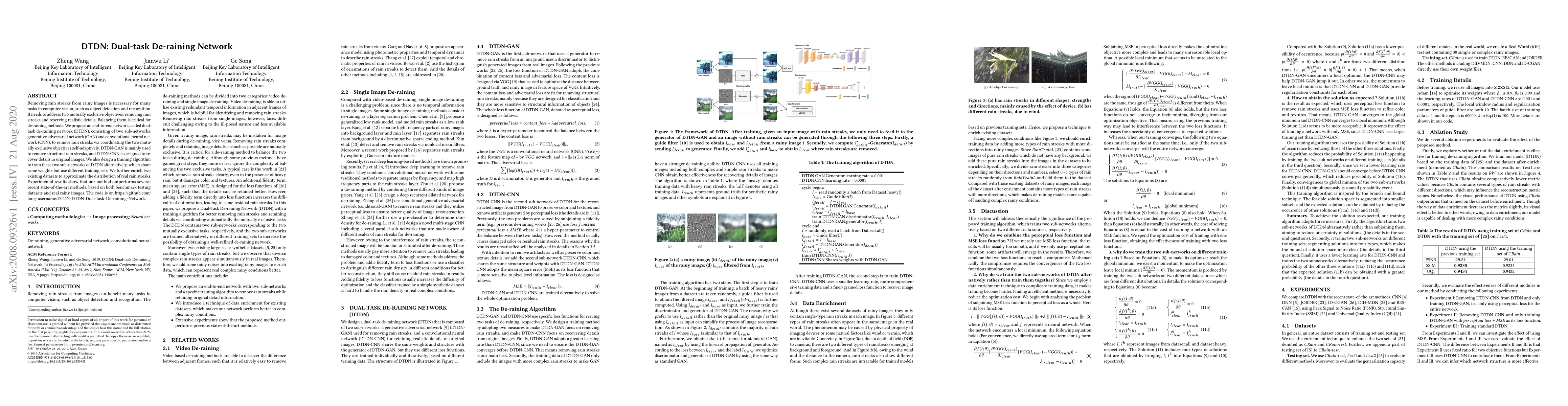 The DTDN network combines a GAN and CNN to adaptively remove rain streaks while preserving image details, achieving superior performance compared to recent methods. The dual-task training algorithm and enriched datasets enhance the network's effectiveness in real-world applications.