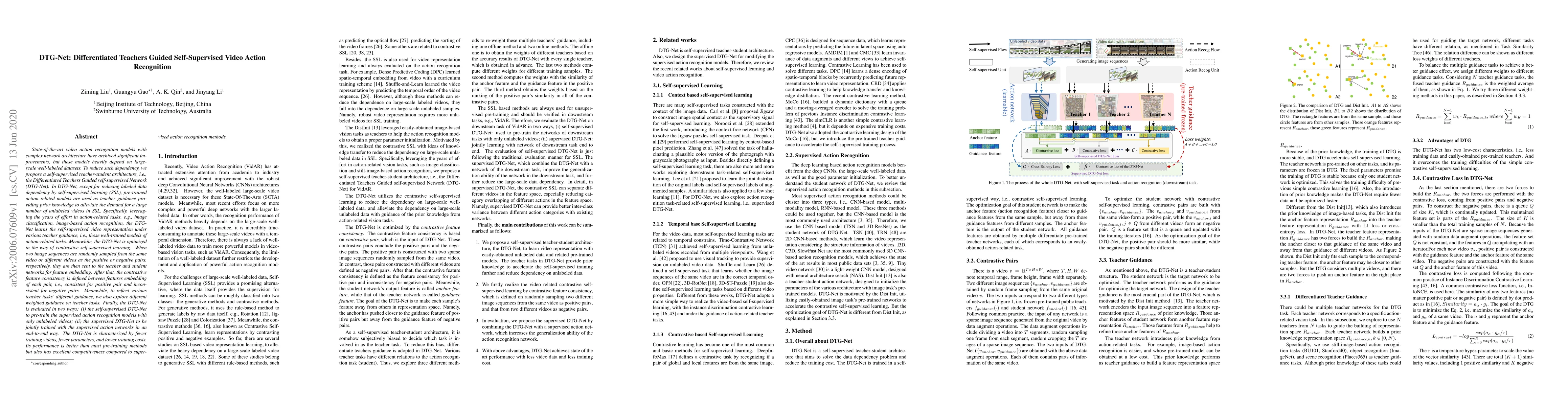 DTG-Net proposes a self-supervised teacher-student architecture to reduce the dependency on large-scale labeled datasets for video action recognition, utilizing pre-trained models for guidance and contrastive learning to embed video representations. It achieves superior performance in pre-training and end-to-end training scenarios.