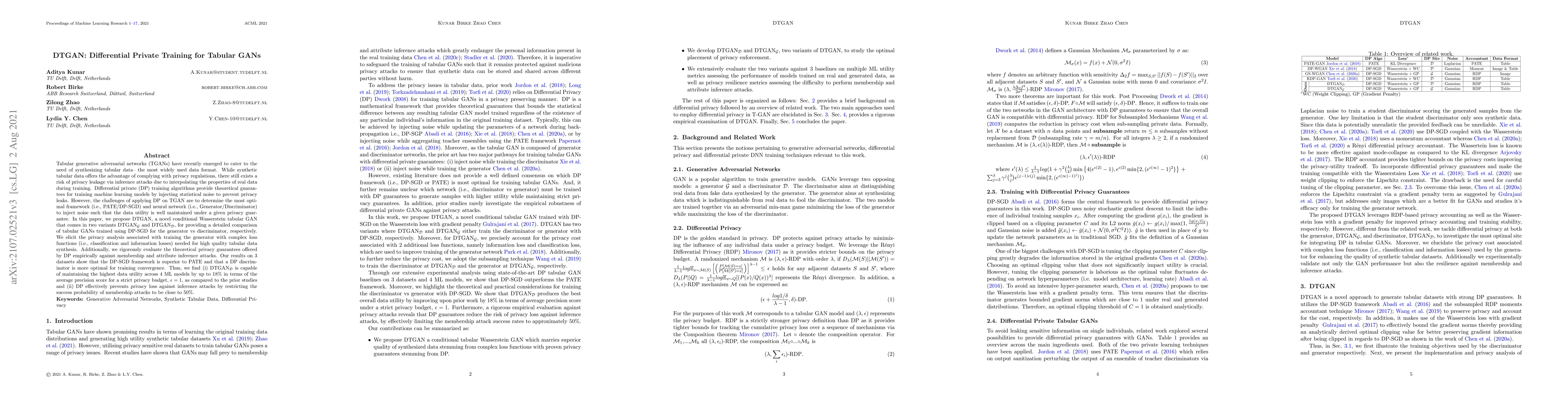 DTGAN introduces a novel differential private training framework for tabular GANs, comparing DP-SGD applied to the generator vs discriminator. Results show DP-SGD and DP discriminator training maintain higher data utility and better privacy against inference attacks.