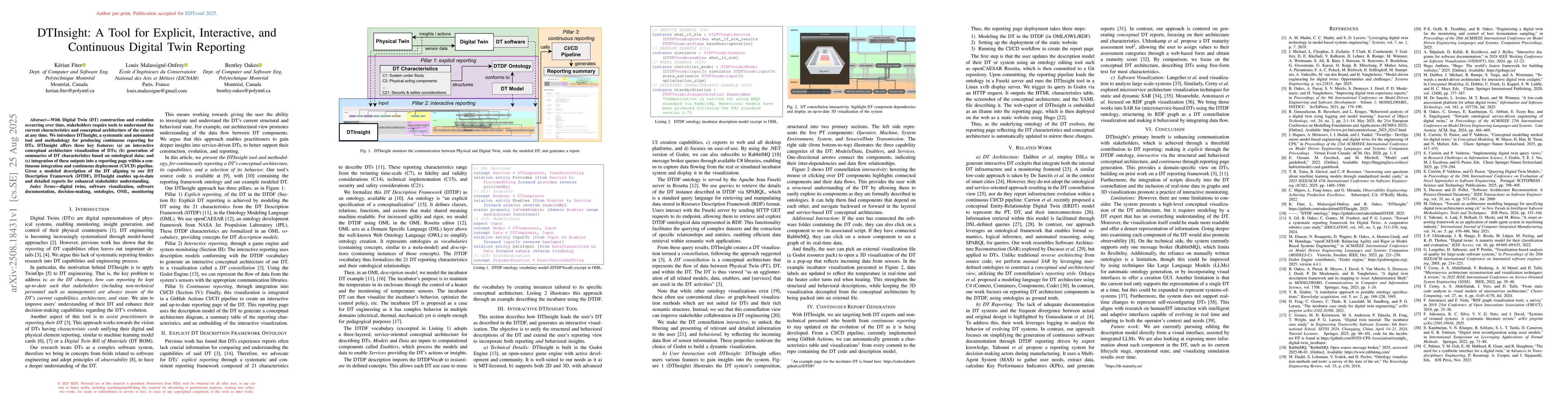 With Digital Twin (DT) construction and evolution occurring over time, stakeholders require tools to understand the current characteristics and conceptual architecture of the system at any time. We introduce DTInsight, a systematic and automated tool and methodology for producing continuous reporting for DTs. DTInsight offers three key features: (a) an interactive conceptual architecture visualization of DTs; (b) generation of summaries of DT characteristics based on ontological data; and (c) integration of these outputs into a reporting page within a continuous integration and continuous deployment (CI/CD) pipeline. Given a modeled description of the DT aligning to our DT Description Framework (DTDF), DTInsight enables up-to-date and detailed reports for enhanced stakeholder understanding.