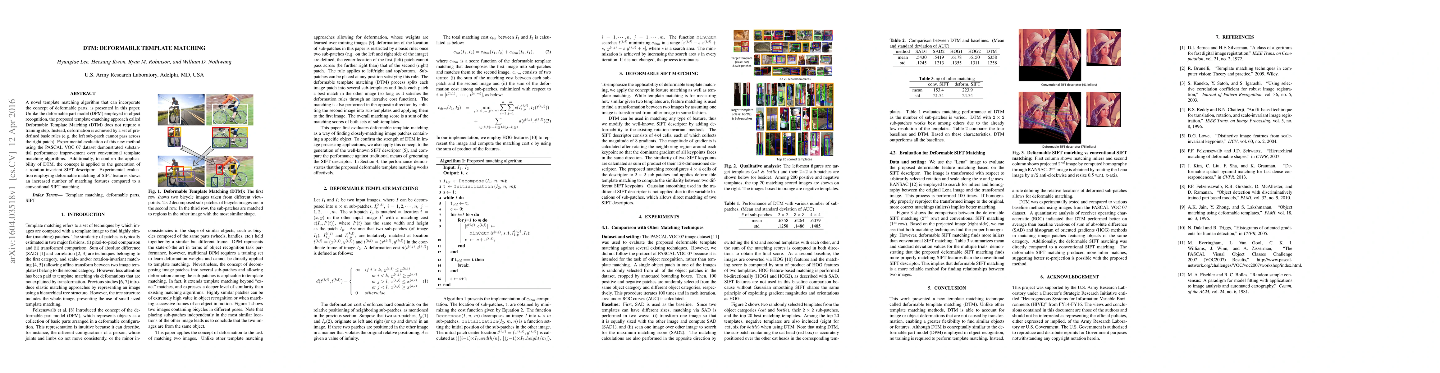 The paper introduces a novel Deformable Template Matching (DTM) algorithm that enhances template matching through deformable parts without requiring training, using predefined rules for deformation. Experimental results on the PASCAL VOC 07 dataset show significant performance gains over conventional methods, and DTM also improves the generation of rotation-invariant SIFT descriptors.