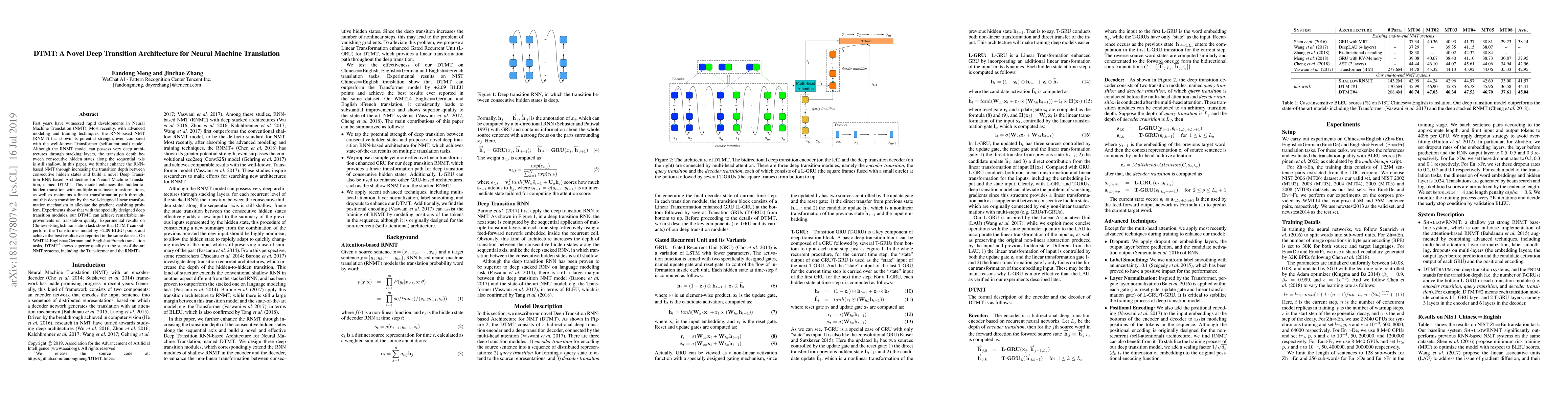 The paper introduces DTMT, a novel Deep Transition Architecture for Neural Machine Translation, which enhances RNN-based models by increasing the transition depth between hidden states. DTMT achieves superior translation quality, outperforming the Transformer model by +2.09 BLEU points on Chinese->English translation and showing state-of-the-art results on WMT14 English->German and English->French tasks.