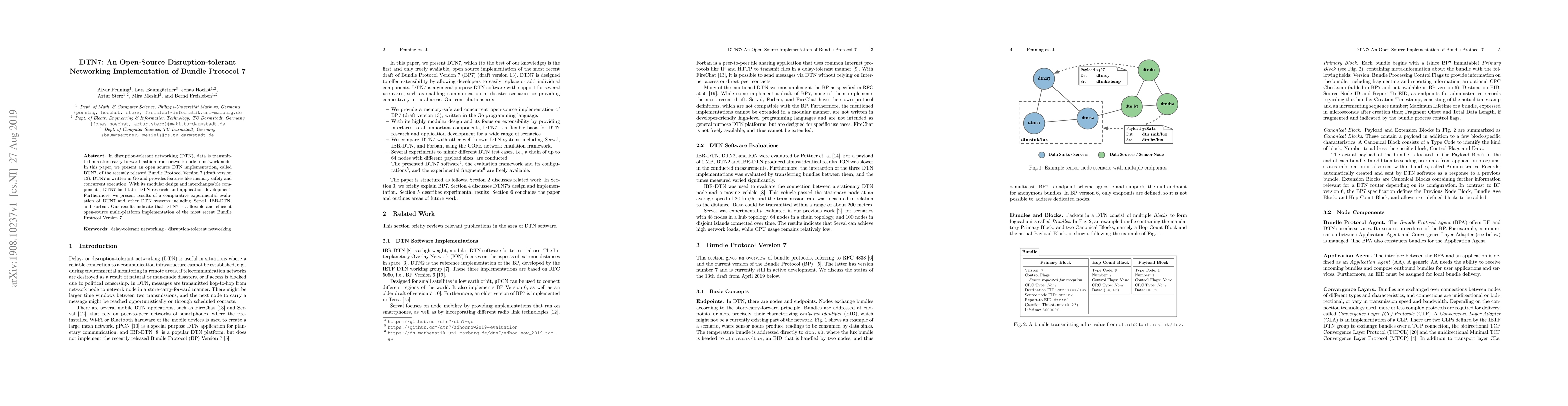 This paper introduces DTN7, an open-source implementation of Bundle Protocol Version 7 in Go, designed for disruption-tolerant networking. DTN7 offers memory safety and concurrent execution, and its modular design supports DTN research and application development, as demonstrated by comparative evaluations showing its flexibility and efficiency.