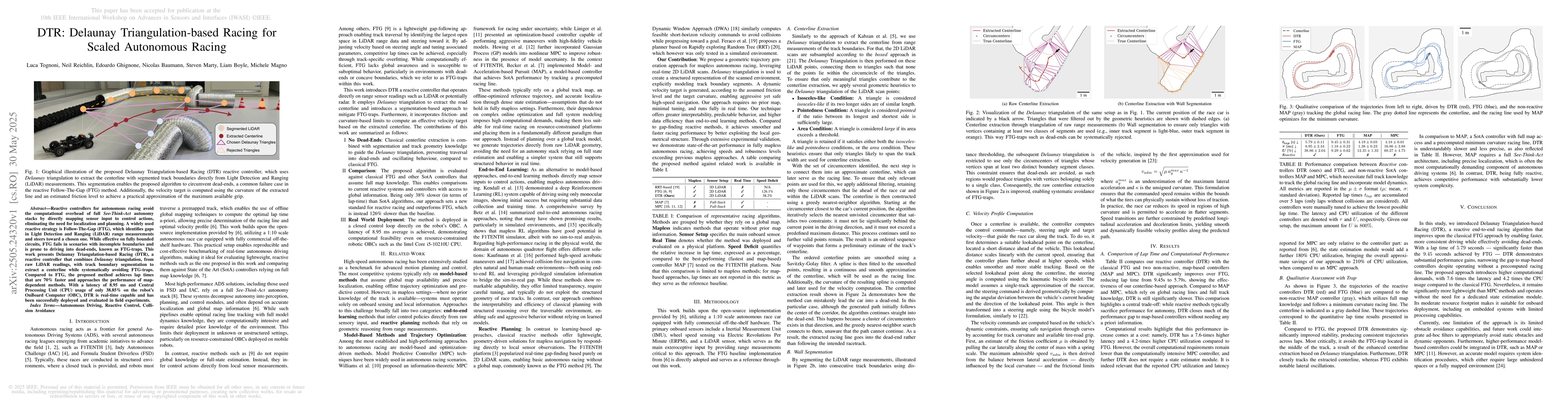 The research proposes DTR, a reactive controller for autonomous racing that utilizes Delaunay triangulation from raw LiDAR readings combined with track boundary segmentation to extract a centerline and avoid FTG-traps.