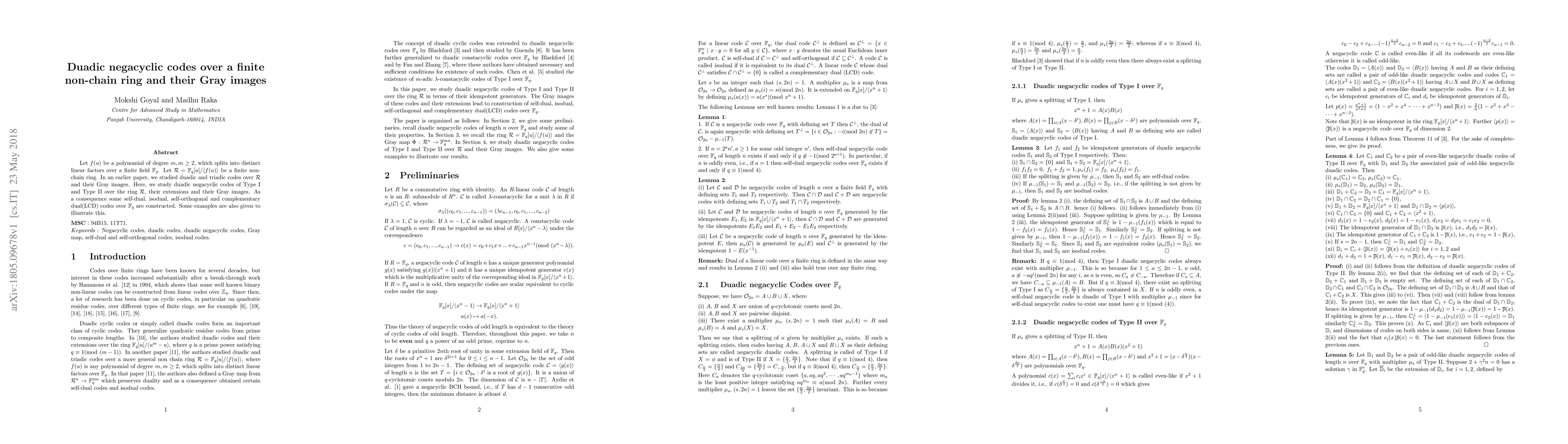 Let $f(u)$ be a polynomial of degree $m, m \geq 2,$ which splits into distinct linear factors over a finite field $\mathbb{F}_{q}$. Let $\mathcal{R}=\mathbb{F}_{q}[u]/\langle f(u)\rangle$ be a finite non-chain ring. In an earlier paper, we studied duadic and triadic codes over $\mathcal{R}$ and their Gray images. Here, we study duadic negacyclic codes of Type I and Type II over the ring $\mathcal{R}$, their extensions and their Gray images. As a consequence some self-dual, isodual, self-orthogonal and complementary dual(LCD) codes over $\mathbb{F}_q$ are constructed. Some examples are also given to illustrate this.