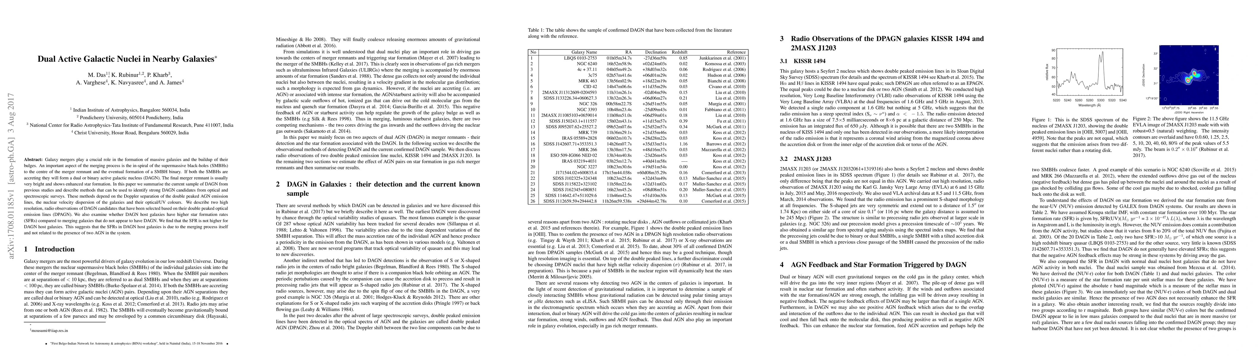 Galaxy mergers play a crucial role in the formation of massive galaxies and the buildup of their bulges. An important aspect of the merging process is the in-spiral of the supermassive black-holes (SMBHs) to the centre of the merger remnant and the eventual formation of a SMBH binary. If both the SMBHs are accreting they will form a dual or binary active galactic nucleus (DAGN). The final merger remnant is usually very bright and shows enhanced star formation. In this paper we summarize the current sample of DAGN from previous studies and describe methods that can be used to identify strong DAGN candidates from optical and spectroscopic surveys. These methods depend on the Doppler separation of the double peaked AGN emission lines, the nuclear velocity dispersion of the galaxies and their optical/UV colours. We describe two high resolution, radio observations of DAGN candidates that have been selected based on their double peaked optical emission lines (DPAGN). We also examine whether DAGN host galaxies have higher star formation rates (SFRs) compared to merging galaxies that do not appear to have DAGN. We find that the SFR is not higher for DAGN host galaxies. This suggests that the SFRs in DAGN host galaxies is due to the merging process itself and not related to the presence of two AGN in the system.