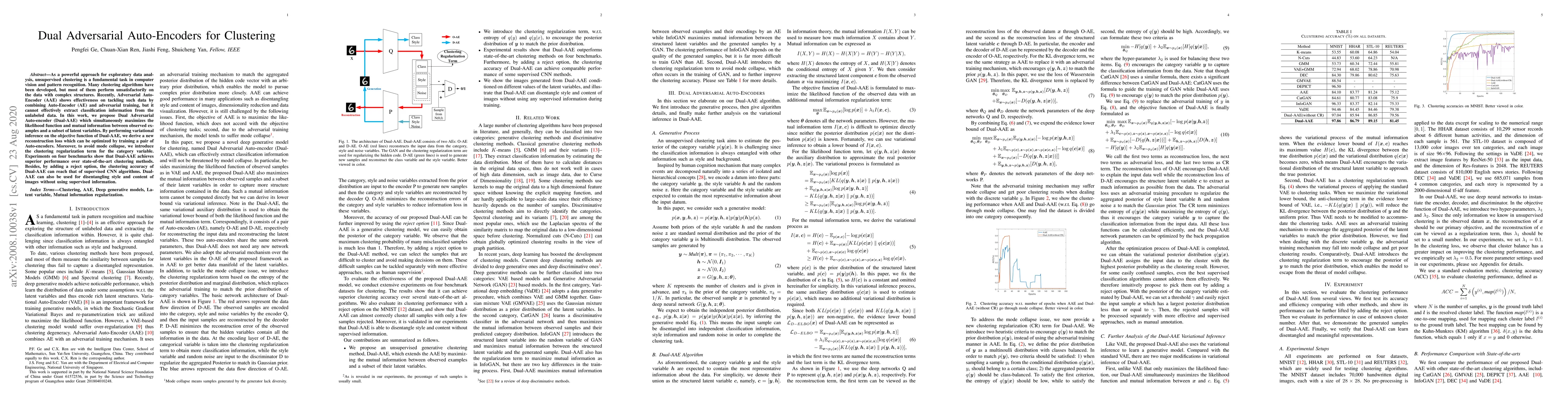 As a powerful approach for exploratory data analysis, unsupervised clustering is a fundamental task in computer vision and pattern recognition. Many clustering algorithms have been developed, but most of them perform unsatisfactorily on the data with complex structures. Recently, Adversarial Auto-Encoder (AAE) shows effectiveness on tackling such data by combining Auto-Encoder (AE) and adversarial training, but it cannot effectively extract classification information from the unlabeled data. In this work, we propose Dual Adversarial Auto-encoder (Dual-AAE) which simultaneously maximizes the likelihood function and mutual information between observed examples and a subset of latent variables. By performing variational inference on the objective function of Dual-AAE, we derive a new reconstruction loss which can be optimized by training a pair of Auto-encoders. Moreover, to avoid mode collapse, we introduce the clustering regularization term for the category variable. Experiments on four benchmarks show that Dual-AAE achieves superior performance over state-of-the-art clustering methods. Besides, by adding a reject option, the clustering accuracy of Dual-AAE can reach that of supervised CNN algorithms. Dual-AAE can also be used for disentangling style and content of images without using supervised information.