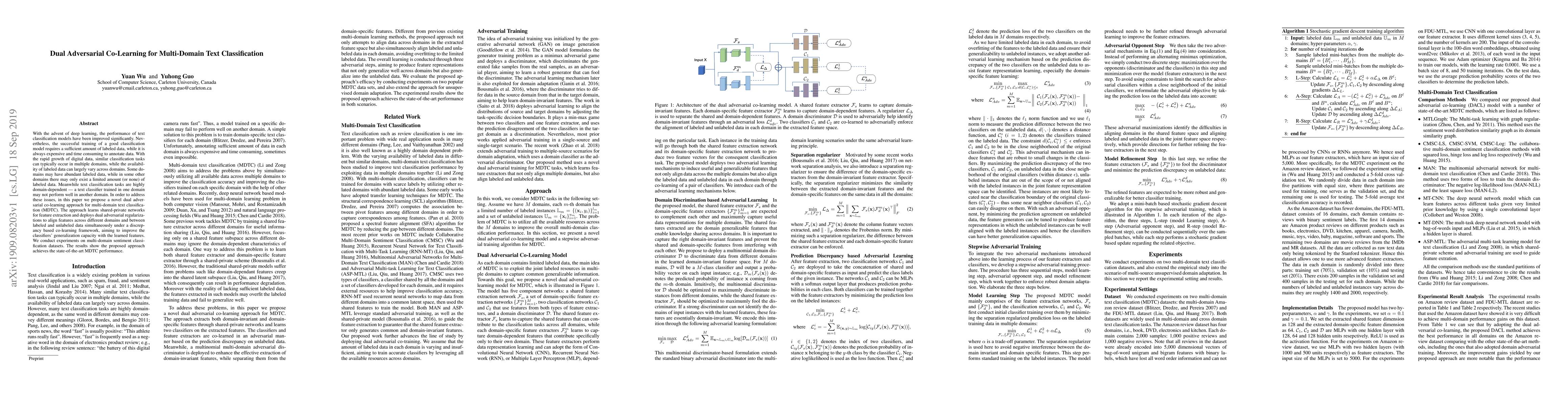 This paper introduces a dual adversarial co-learning approach for multi-domain text classification, utilizing shared-private networks and dual adversarial regularizations to enhance feature alignment and generalization. Experimental results on sentiment datasets demonstrate state-of-the-art performance.
